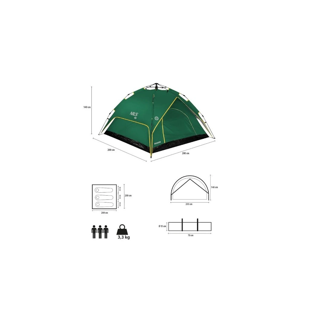NILS Camp NC7819 Shadow je 3 osobový stan, který oceníte při toulkách přírodou, spaní pod "širákem" a nebo při krátkém pobytu v kempu. Odnímatelné tropiko lze využít jako přístřešek, který vás ochrání před deštěm a nebo sluncem. Automatická skládací konstrukce zajišťuje rychlé složení a rozložení stanu.