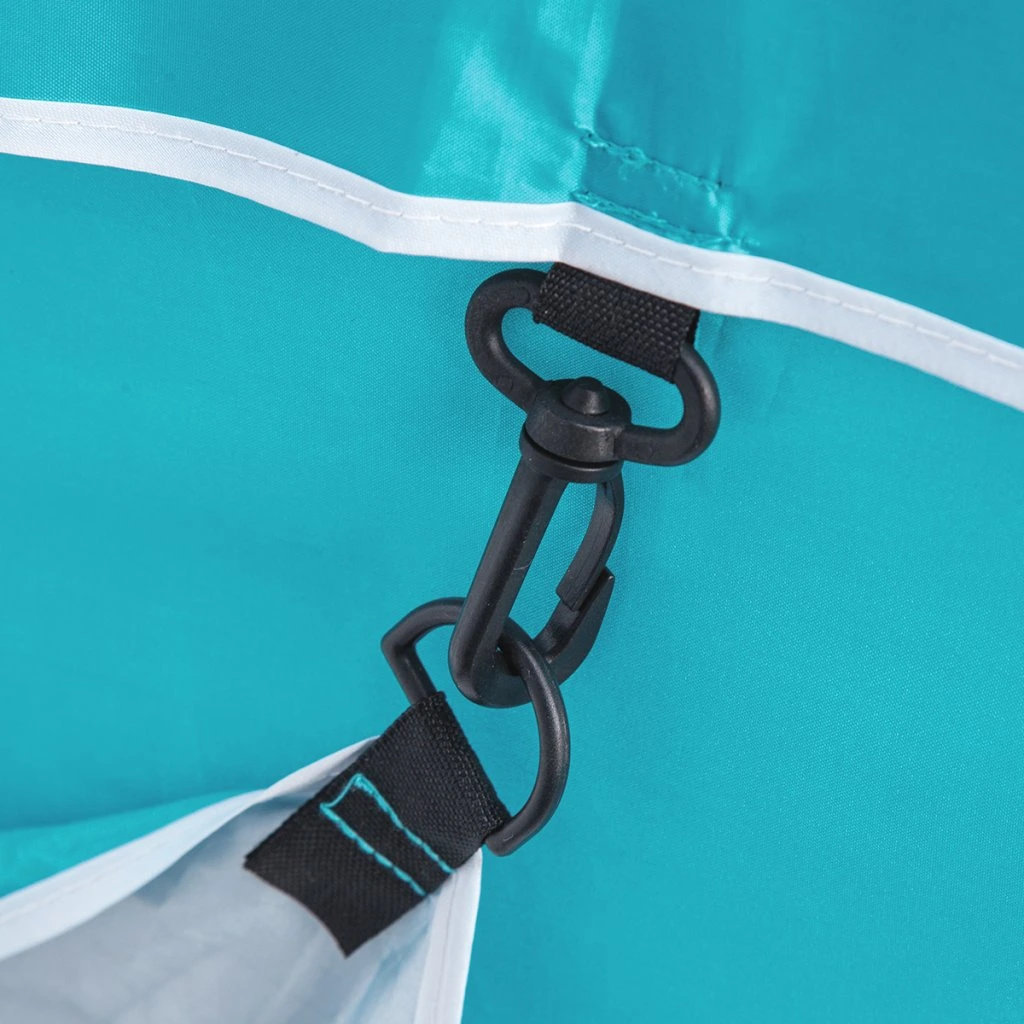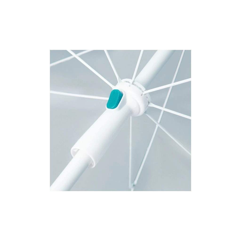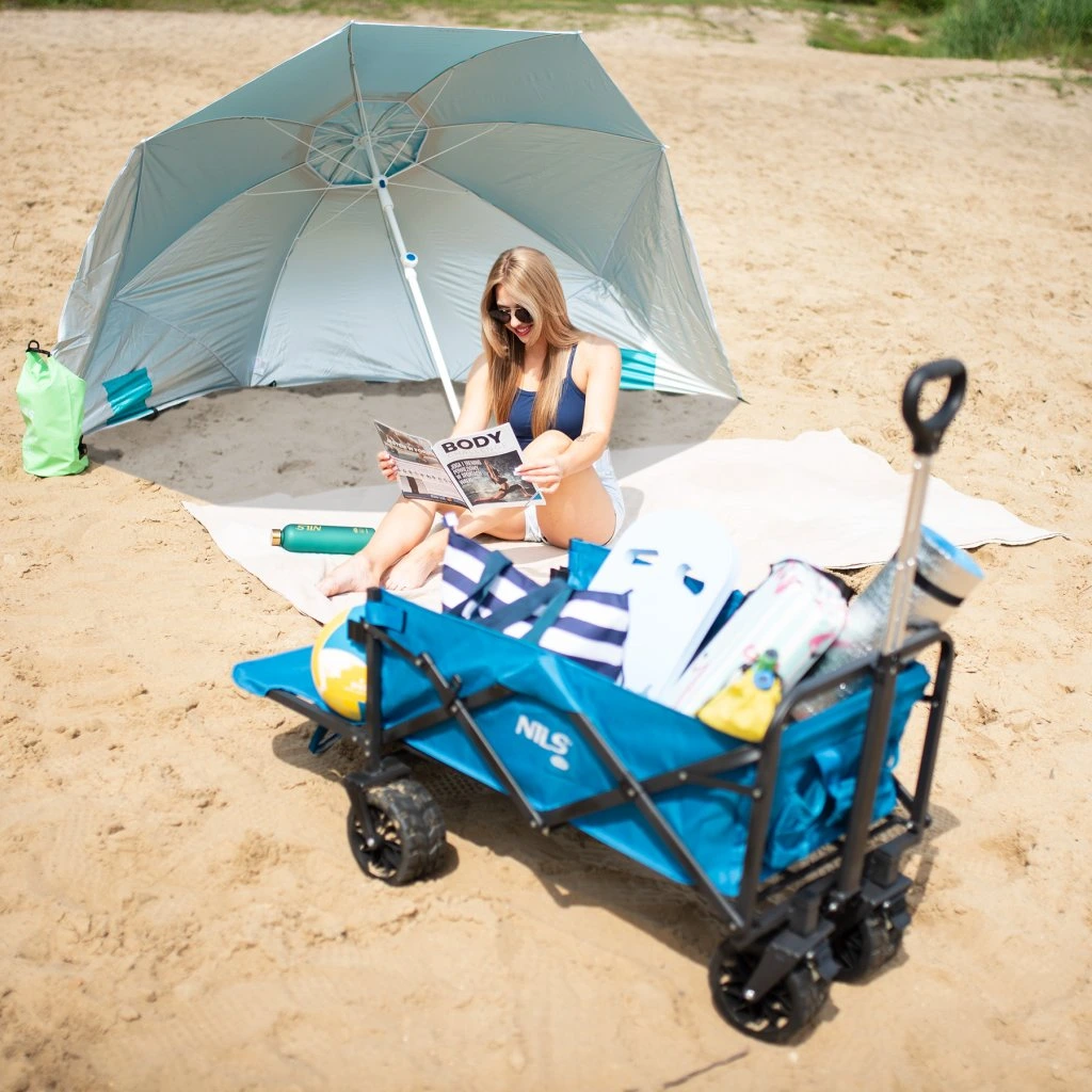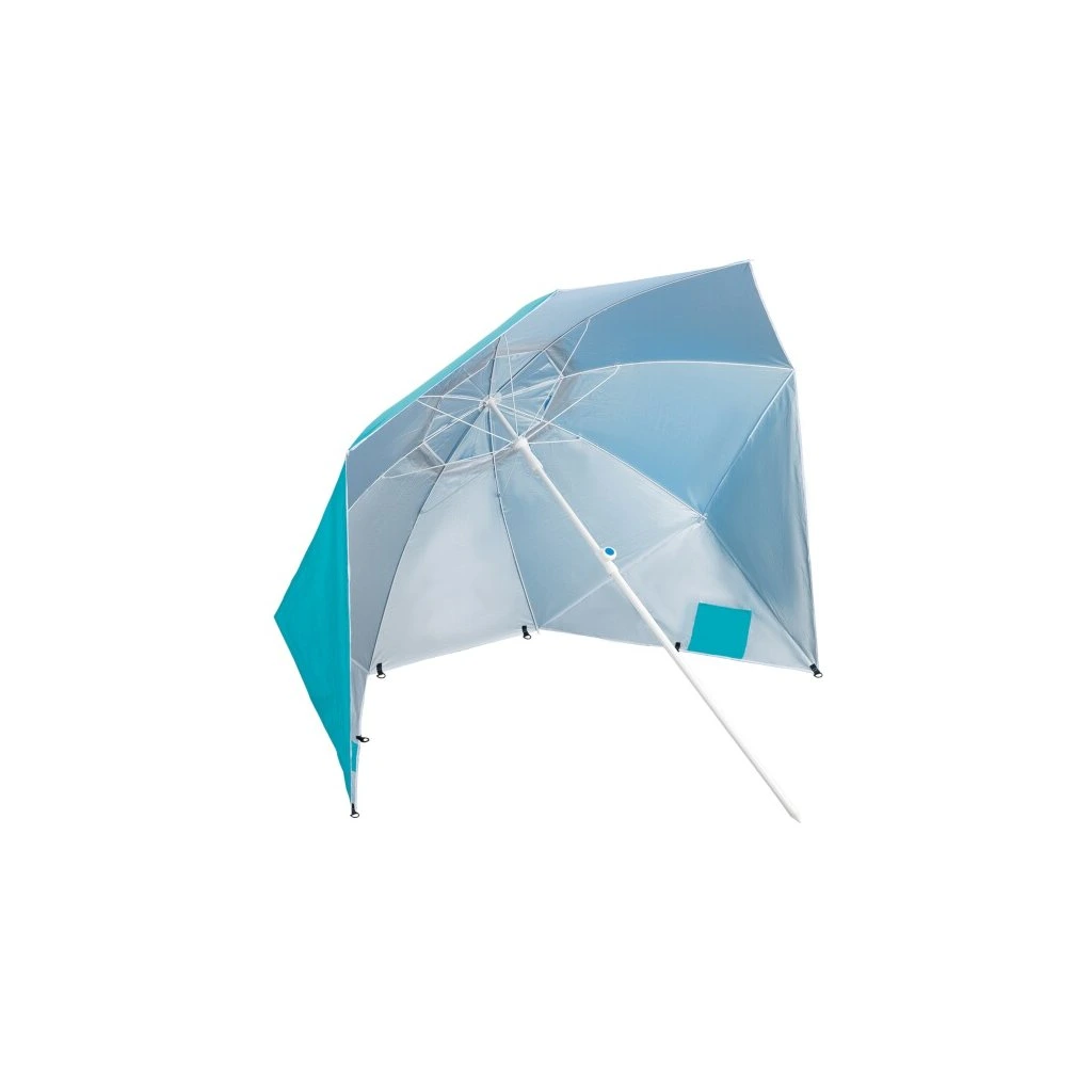 Plážový slunečník s možností použití jako plážová zástěna, to je NILS Camp NC7822. Slunečník je ideálním parťákem během slunečného odpoledne na pláži a nebo na zahradě. NC7822 se snadno přenáší díky dodávanému vaku s poutkem přes rameno. Spodní tyč je osazena špičkou pro snadné zapíchnutí do podkladu. Polyesterová plachta má průměr 190 centimetrů a dokonale chrání před slunečním svitem a škodlivým UV zařením. Na 2 protilehlých stranách se nachází bočnice o šířce 75 centimetrů, které se použijí při položení slunečníku na podklad a slouží jako okraje plážové zástěny, ta se zajistí k podkladu pomocí 4 dodávaných kolíků. Pokud NC7822 používáme jako slunečník, můžeme bočnice pomocí plastových karabinek připnout k vrchlíku, aby nám nepřekážely.