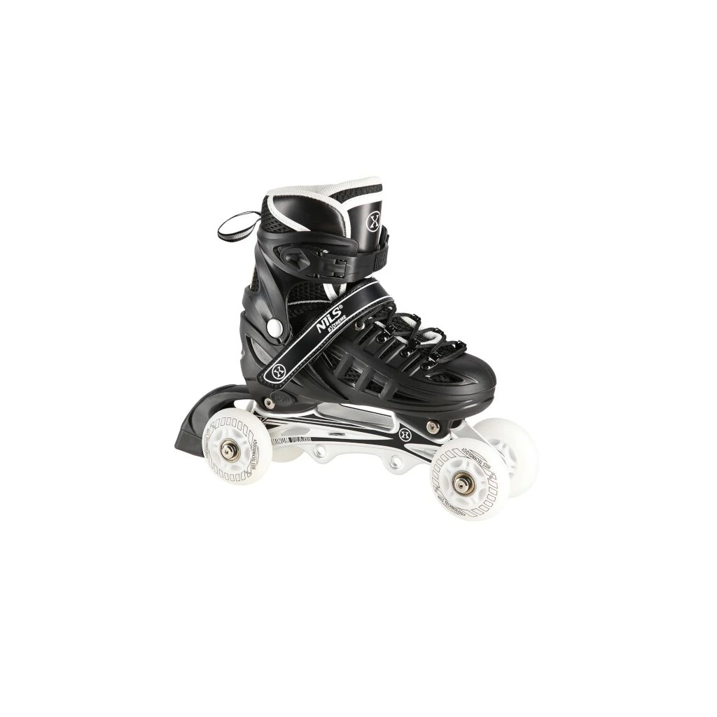 Brusle NILS Extreme NH10905 jsou multifunkční model, který nabízí hned 4 možnosti sestavení podvozku – jako brusle na led, in-line brusle, taneční (quad) brusle a pro nejmenší kombinaci 2+1+1 + nůž na led. Díky tomu jde o univerzální řešení, které se přizpůsobí věku i dovednostem uživatele a poskytne radost z jízdy po celý rok.