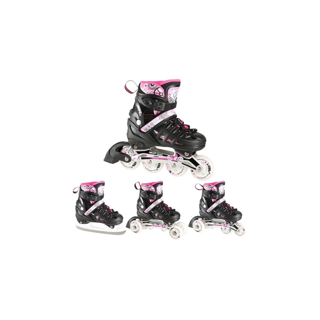 Brusle NILS Extreme NH10905 jsou multifunkční model, který nabízí hned 4 možnosti sestavení podvozku – jako brusle na led, in-line brusle, taneční (quad) brusle a pro nejmenší kombinaci 2+1+1 + nůž na led. Díky tomu jde o univerzální řešení, které se přizpůsobí věku i dovednostem uživatele a poskytne radost z jízdy po celý rok.