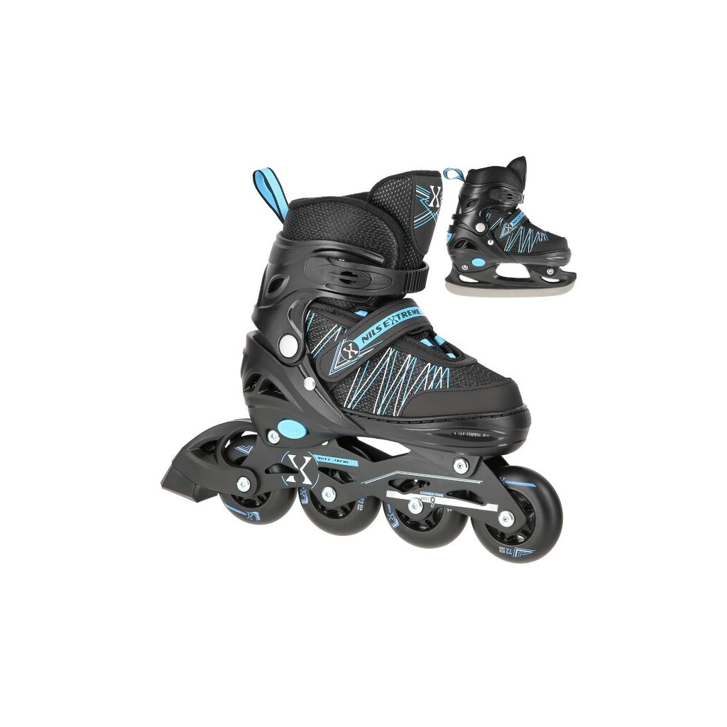 NILS Extreme NH11912 A jsou celoroční brusle pro všechny milovníky letního i zimního bruslení. Brusle mají vyměnitelný podvozek, takže se dají použít buď jako klasické In-line, nebo lední brusle.