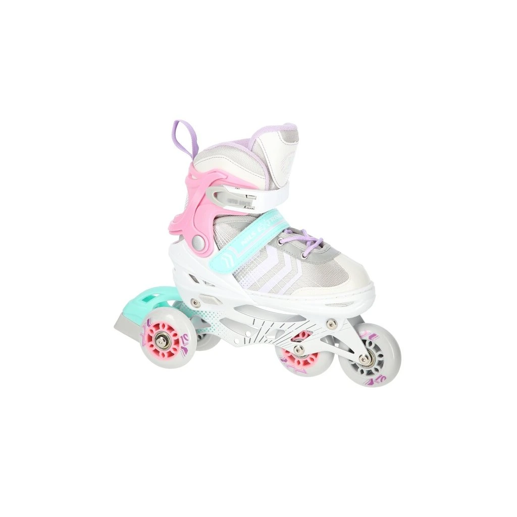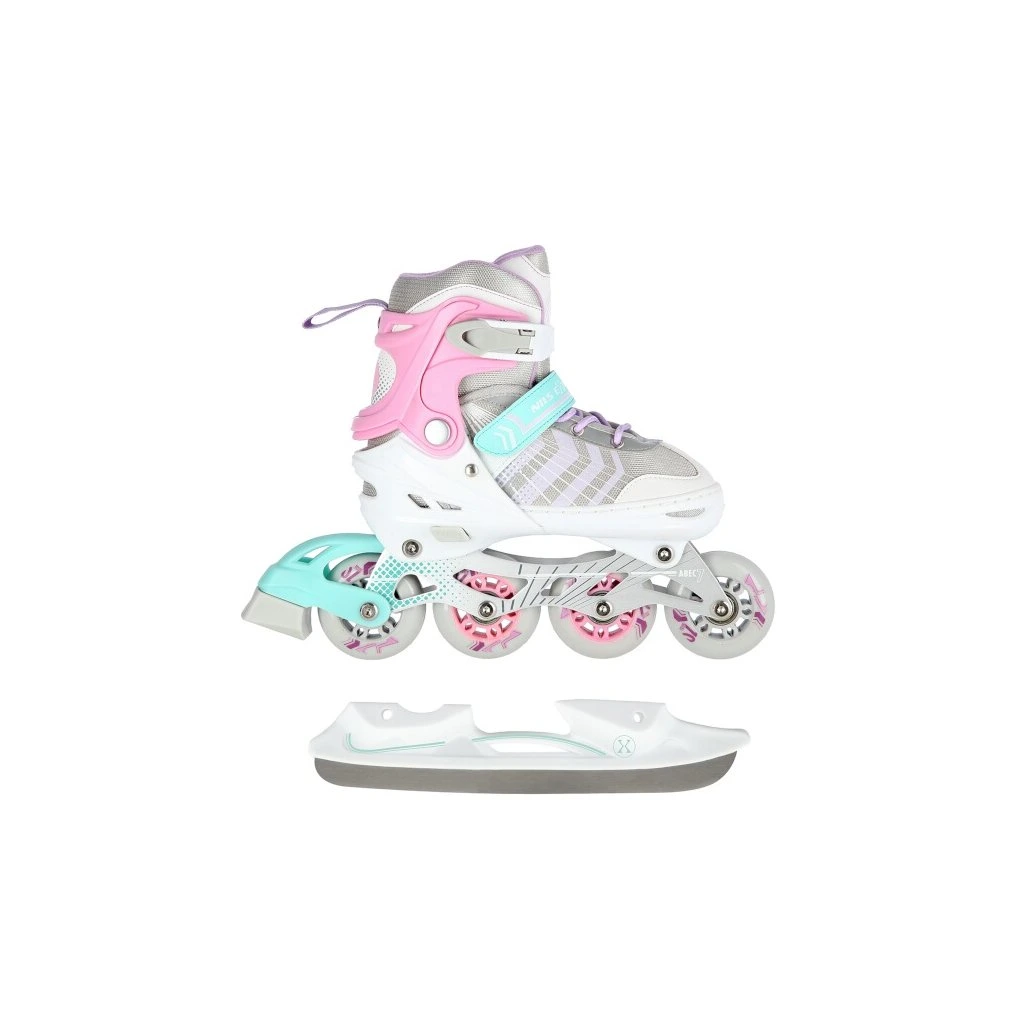 NILS Extreme NH18192 jsou kolečkové brusle 4v1 s vyměnitelným nožem na led, které jsou určeny pro začínající a středně pokročilé uživatele. Hliníkový podvozek je osazen měkkými PU kolečky s ložisky ABEC7 pro svižnou jízdu. Vnější bota je pomocí stisku tlačítka nastavitelná do čtyř velikostí, toto řešení umožňuje precizní přizpůsobení velikosti podle aktuálních potřeb anebo se používá jako "rostoucí bota", která "roste" spolu s nohou dítěte. Na špičce jsou ventilační otvory pro maximální prodyšnost. Vnitřní bota je vyrobena z kombinace semiše, síťoviny MESH, EVA a pěny o vysoké hustotě. Zapínání je řešenou klasickou trojkombinací - šněrování, řemínek se suchým zipem a dvousekční přezka. Součástí balení je sada šroubů a podložek pro přestavbu podvozku do konfigurace 2+1 a 2+2 a pár nožů na led, které jsou vyrobeny z nerez oceli s vysokým podílem uhlíku.