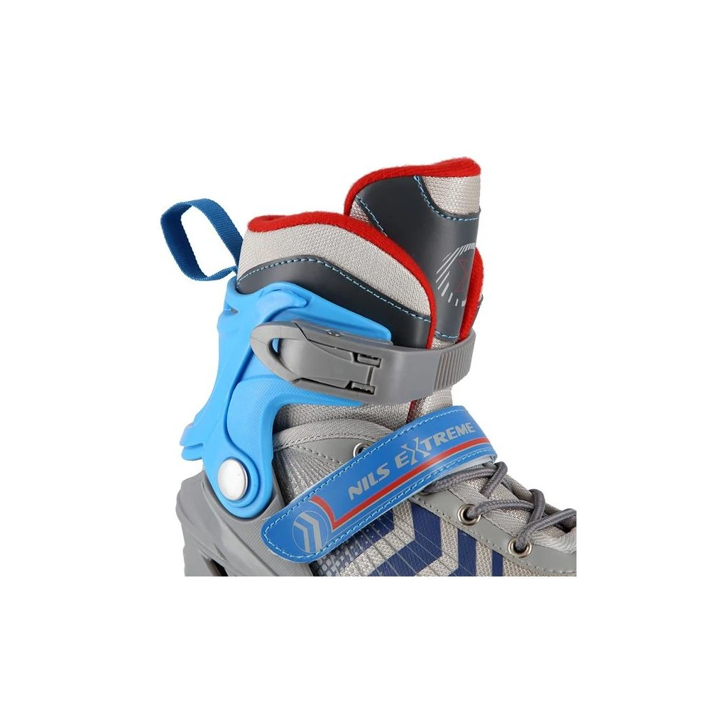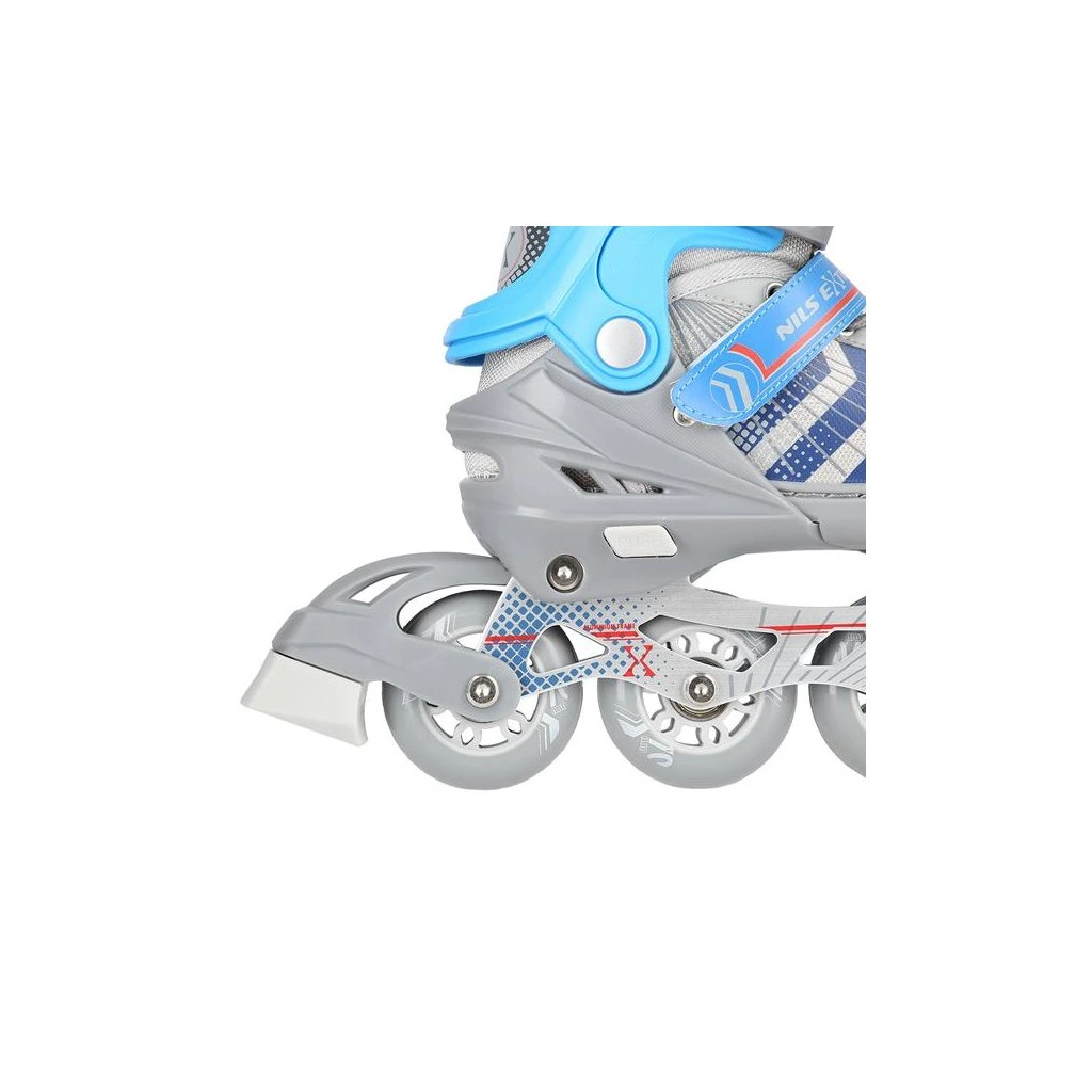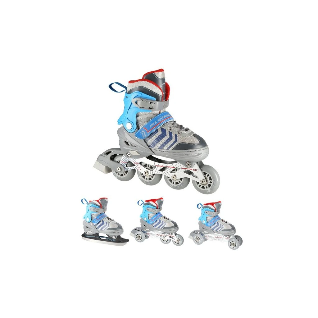 NILS Extreme NH18192 jsou kolečkové brusle 4v1 s vyměnitelným nožem na led, které jsou určeny pro začínající a středně pokročilé uživatele. Hliníkový podvozek je osazen měkkými PU kolečky s ložisky ABEC7 pro svižnou jízdu. Vnější bota je pomocí stisku tlačítka nastavitelná do čtyř velikostí, toto řešení umožňuje precizní přizpůsobení velikosti podle aktuálních potřeb anebo se používá jako "rostoucí bota", která "roste" spolu s nohou dítěte. Na špičce jsou ventilační otvory pro maximální prodyšnost. Vnitřní bota je vyrobena z kombinace semiše, síťoviny MESH, EVA a pěny o vysoké hustotě. Zapínání je řešenou klasickou trojkombinací - šněrování, řemínek se suchým zipem a dvousekční přezka. Součástí balení je sada šroubů a podložek pro přestavbu podvozku do konfigurace 2+1 a 2+2 a pár nožů na led, které jsou vyrobeny z nerez oceli s vysokým podílem uhlíku.