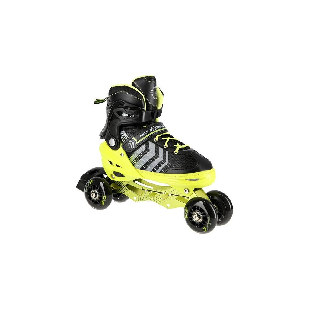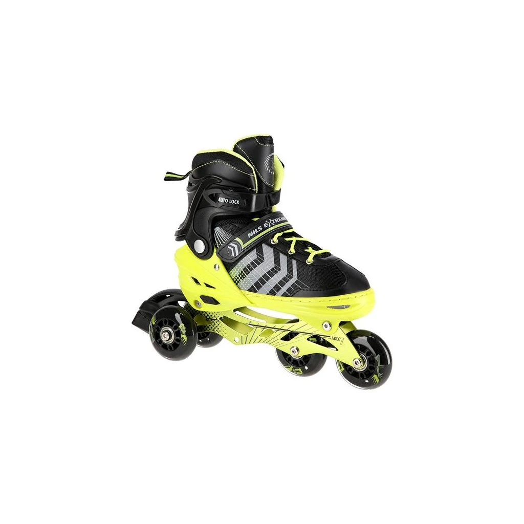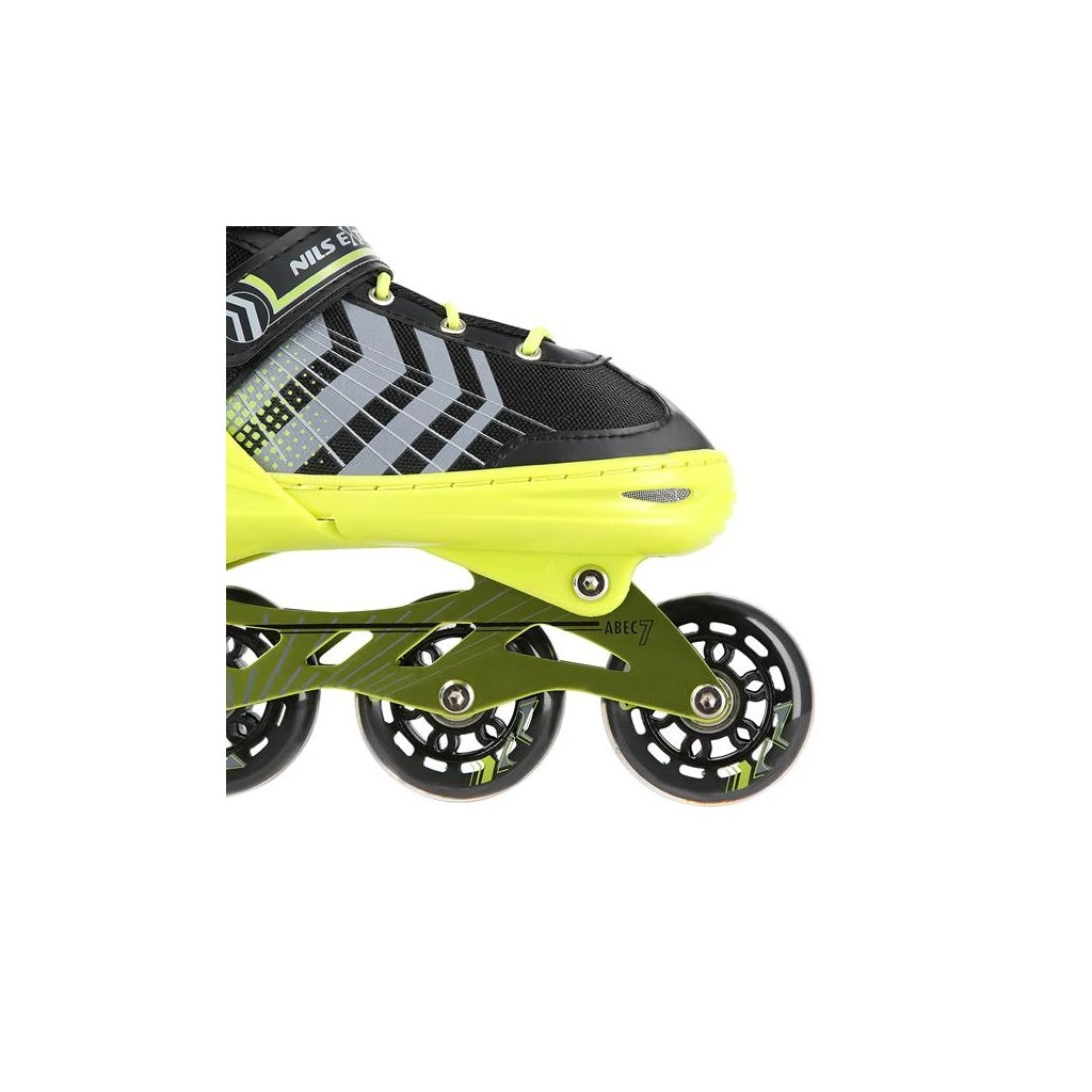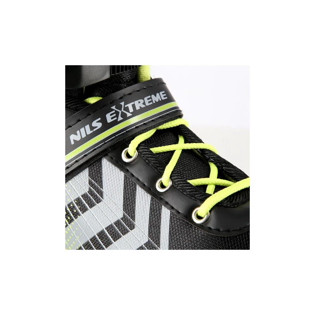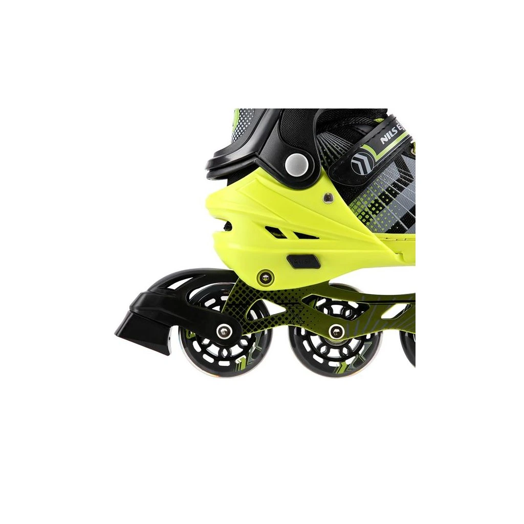 NILS Extreme NH18192 jsou kolečkové brusle 4v1 s vyměnitelným nožem na led, které jsou určeny pro začínající a středně pokročilé uživatele. Hliníkový podvozek je osazen měkkými PU kolečky s ložisky ABEC7 pro svižnou jízdu. Vnější bota je pomocí stisku tlačítka nastavitelná do čtyř velikostí, toto řešení umožňuje precizní přizpůsobení velikosti podle aktuálních potřeb anebo se používá jako "rostoucí bota", která "roste" spolu s nohou dítěte. Na špičce jsou ventilační otvory pro maximální prodyšnost. Vnitřní bota je vyrobena z kombinace semiše, síťoviny MESH, EVA a pěny o vysoké hustotě. Zapínání je řešenou klasickou trojkombinací - šněrování, řemínek se suchým zipem a dvousekční přezka. Součástí balení je sada šroubů a podložek pro přestavbu podvozku do konfigurace 2+1 a 2+2 a pár nožů na led, které jsou vyrobeny z nerez oceli s vysokým podílem uhlíku.