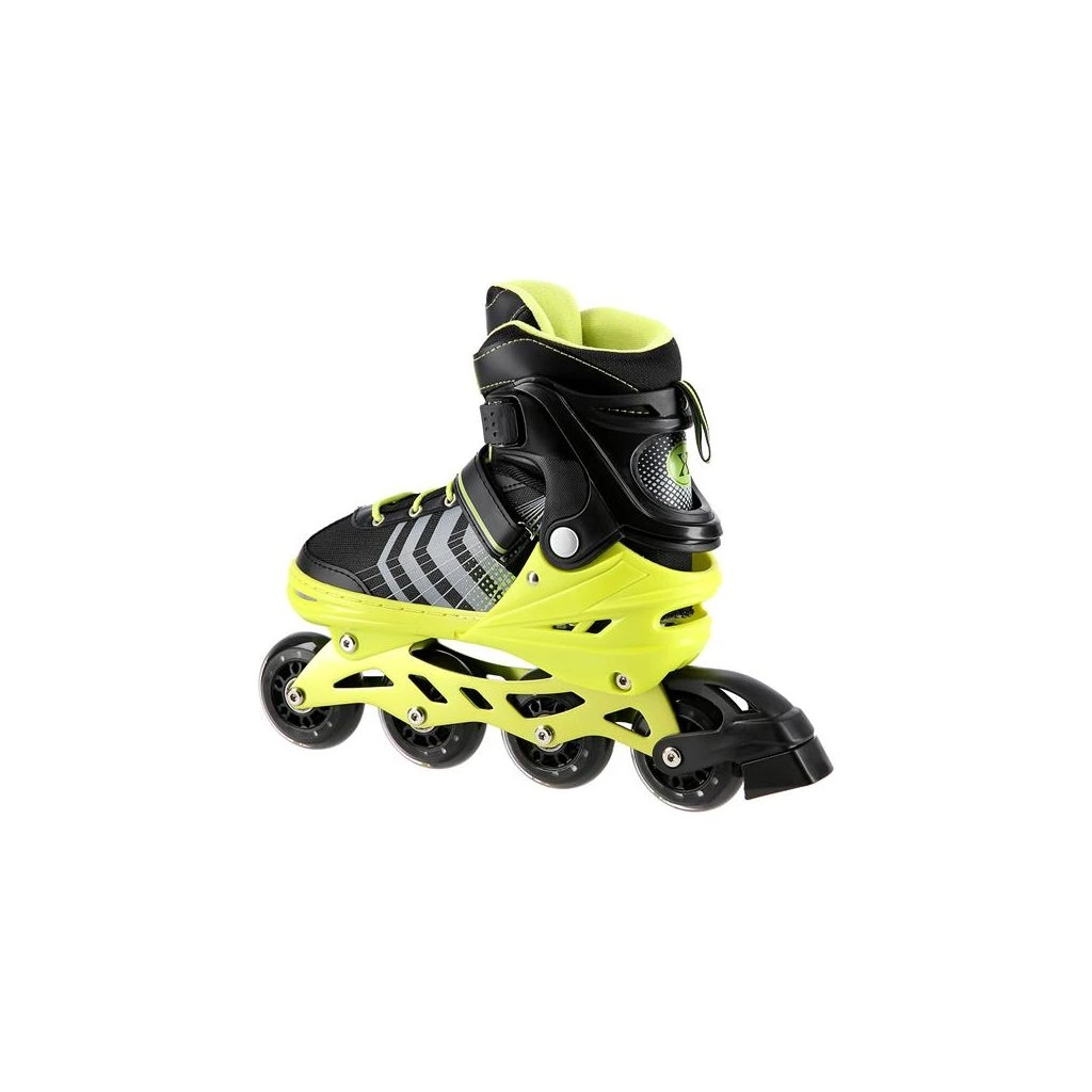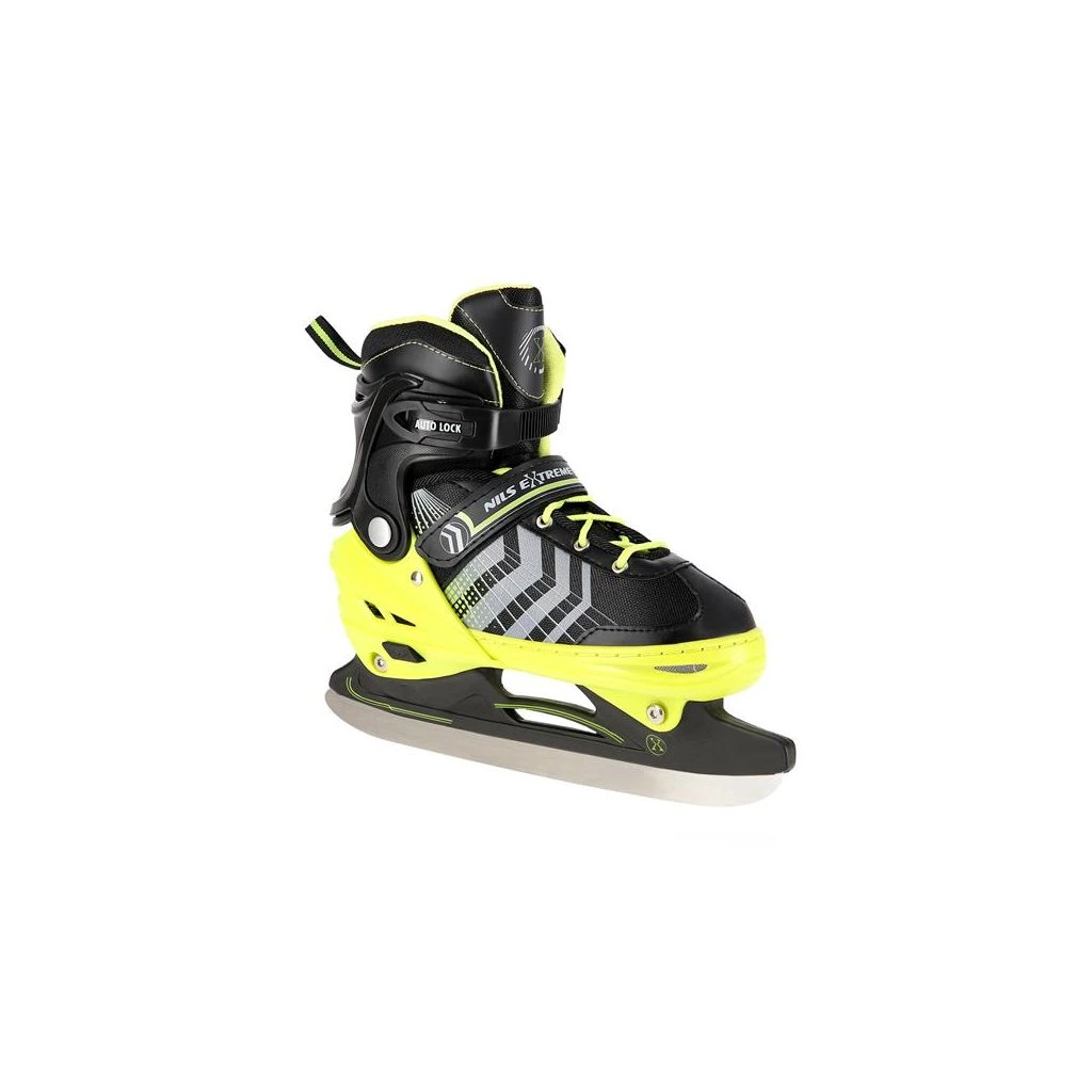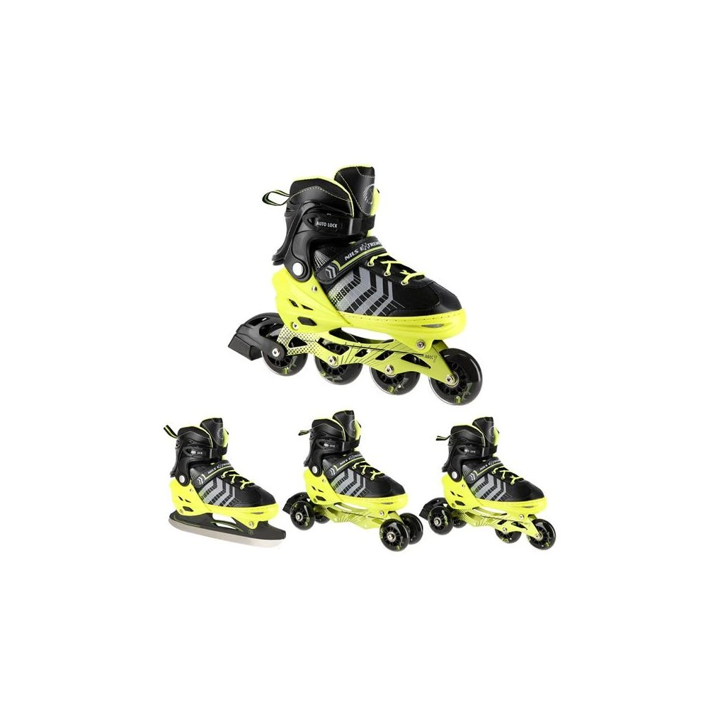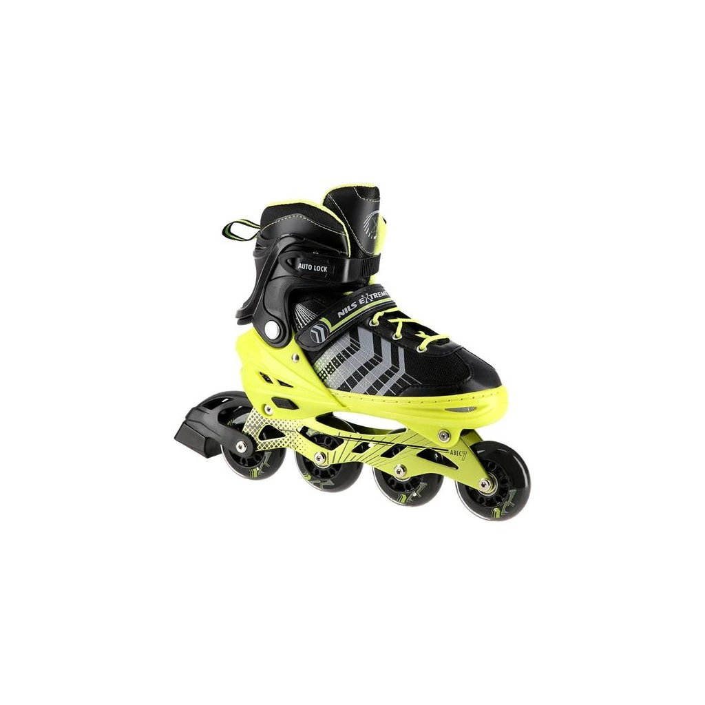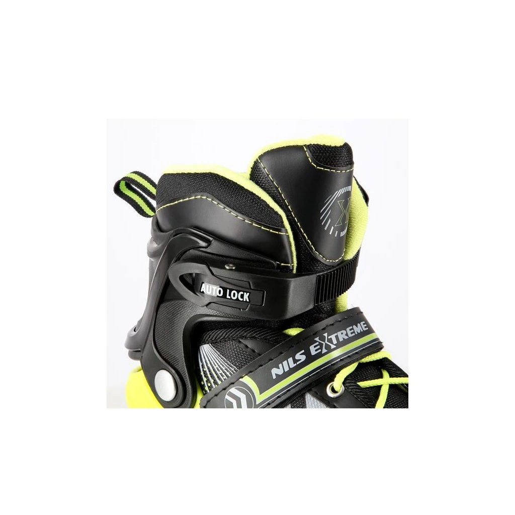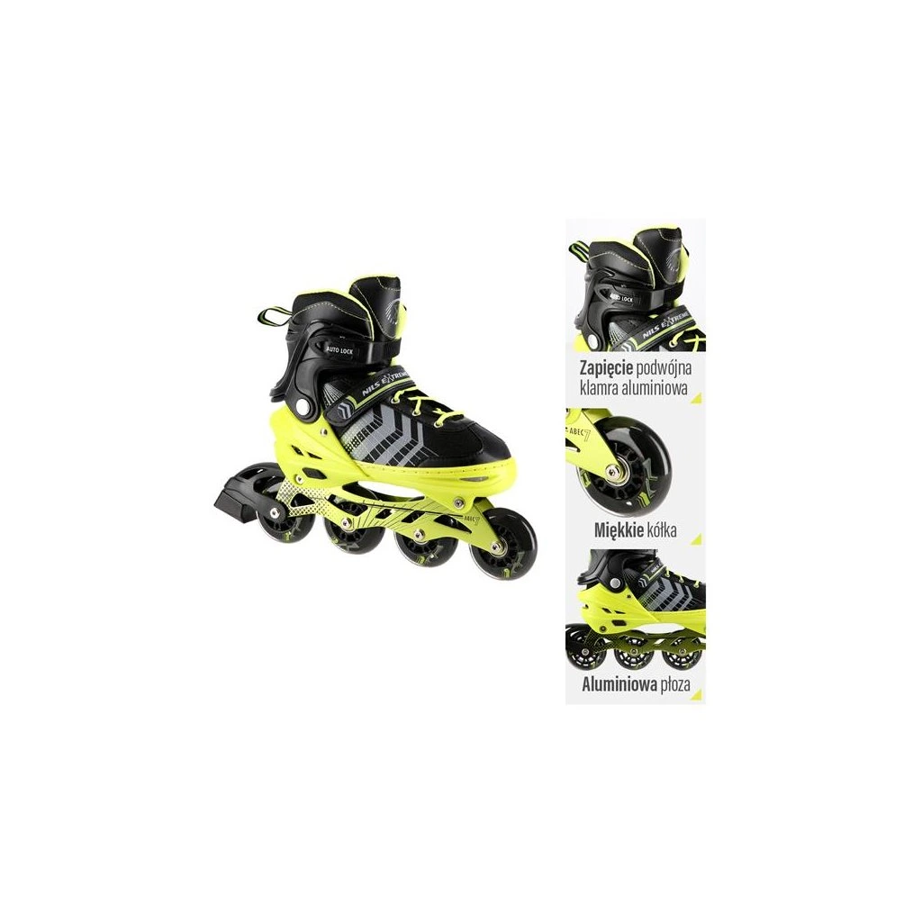 NILS Extreme NH18192 jsou kolečkové brusle 4v1 s vyměnitelným nožem na led, které jsou určeny pro začínající a středně pokročilé uživatele. Hliníkový podvozek je osazen měkkými PU kolečky s ložisky ABEC7 pro svižnou jízdu. Vnější bota je pomocí stisku tlačítka nastavitelná do čtyř velikostí, toto řešení umožňuje precizní přizpůsobení velikosti podle aktuálních potřeb anebo se používá jako "rostoucí bota", která "roste" spolu s nohou dítěte. Na špičce jsou ventilační otvory pro maximální prodyšnost. Vnitřní bota je vyrobena z kombinace semiše, síťoviny MESH, EVA a pěny o vysoké hustotě. Zapínání je řešenou klasickou trojkombinací - šněrování, řemínek se suchým zipem a dvousekční přezka. Součástí balení je sada šroubů a podložek pro přestavbu podvozku do konfigurace 2+1 a 2+2 a pár nožů na led, které jsou vyrobeny z nerez oceli s vysokým podílem uhlíku.