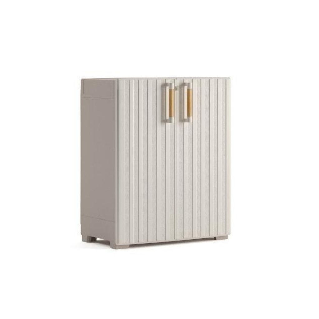Úložná skříň GROOVE nízká, vyrobená z recyklovaného plastu, vodotěsná, 1 nastavitelná police s nosností 15 kg, uzamkytalené dveře (zámek není součástí balení), kovové závěsy pro široké otevření dveří, elegantní dřevěné úchyty, čtyři nastavitelné nohy a pevné vyztužené dno, rozměry: 80 x 45 x 98 cm (š x h x v).