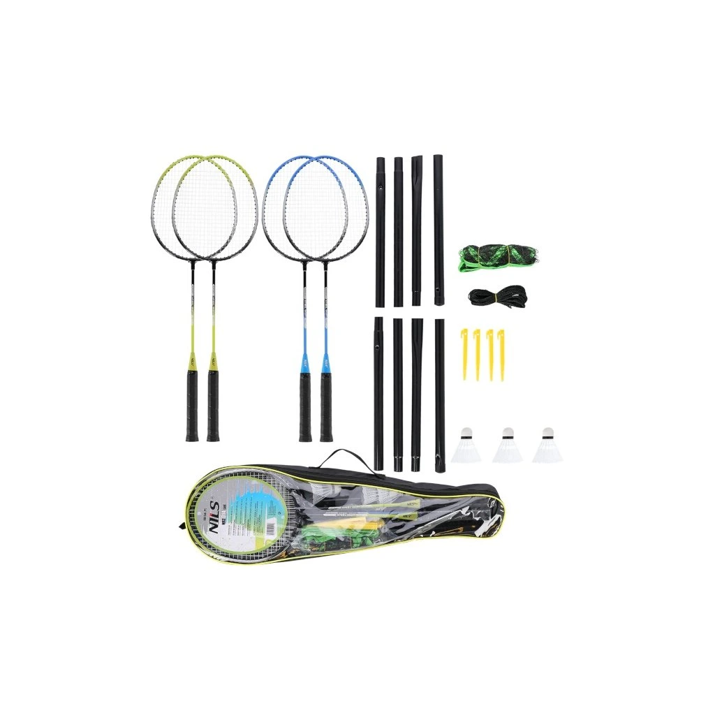 Sada NILS NRZ014 obsahuje 4 rakety, 3 letky, nylonovou síť včetně napínacích šňůr a klíků a 2 skládací sloupky.