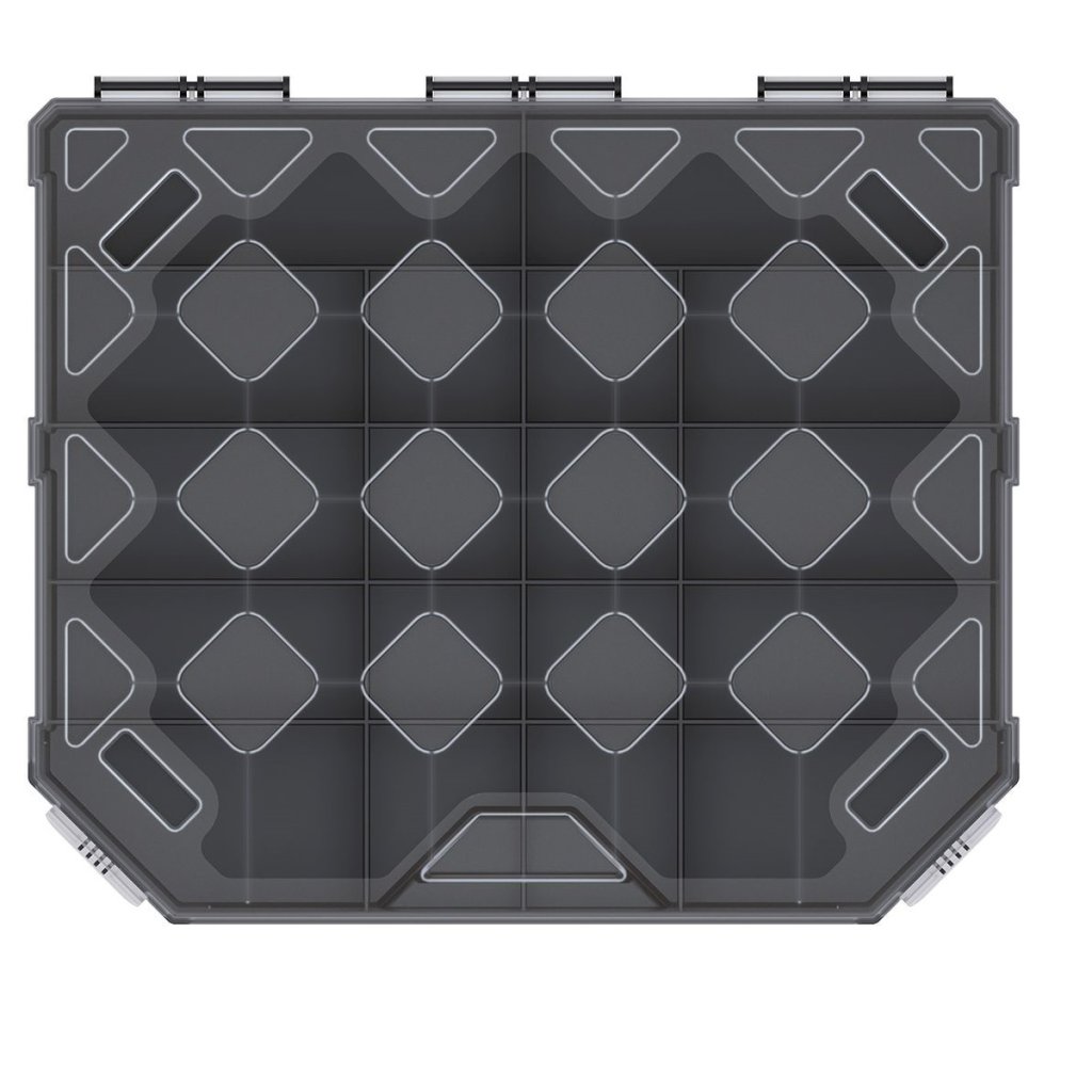 18 přihrádek: 2 velké, 8 středních a 8 malých – ideální rozvržení pro šroubky, hmoždinky, bity, matice i nejmenší drobnosti. Pevné přepážky brání promíchání obsahu i při přenášení, průhledné víko umožní okamžitou kontrolu.