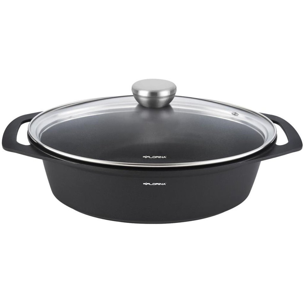 Oválný pekáč, rozměry 33,5 × 25 × 9,8 cm, objem 3,8 l, nepřilnavý 2-vrstvový povrch typu marble, černý s bílými tečkami, vyrobený z odlévaného hliníku, skleněná poklička s nerezovým úchytem, vhodný pro všechny typy varných desek včetně indukce, vhodný do myčky nádobí