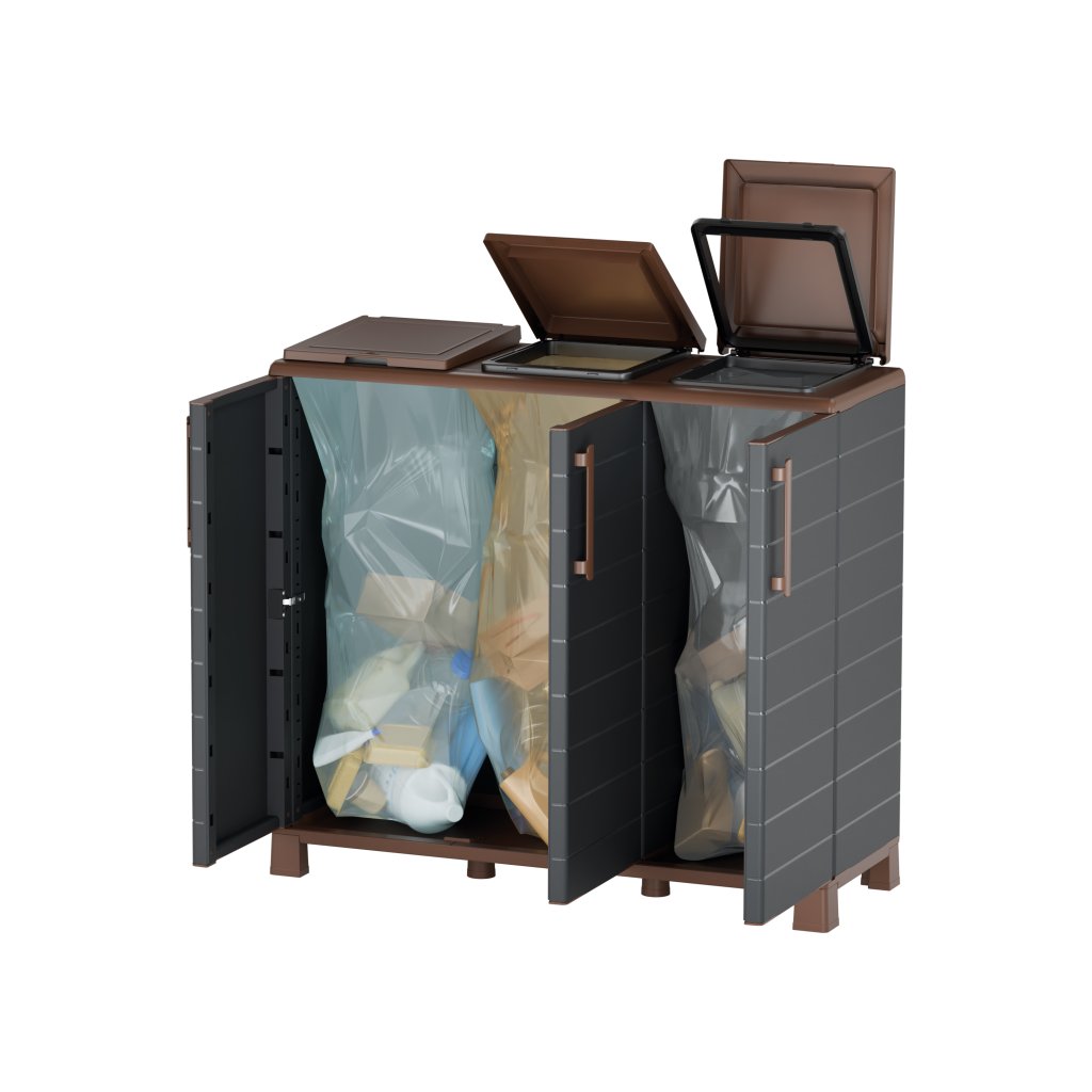 Každá sekce je přizpůsobena pro odpadkové pytle do 110 l. Horní víka s otevíráním až 90° a přední dveře umožňují snadnou manipulaci s odpadem.