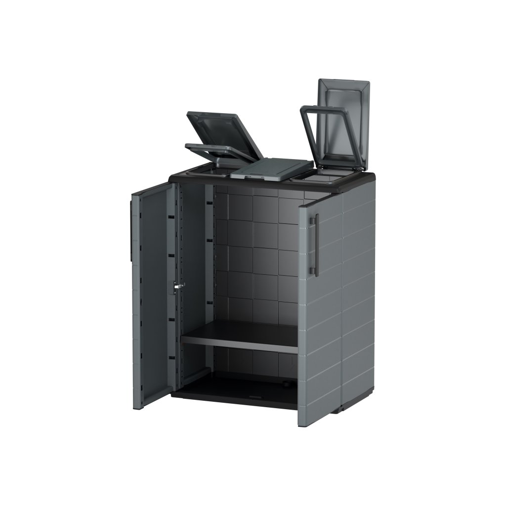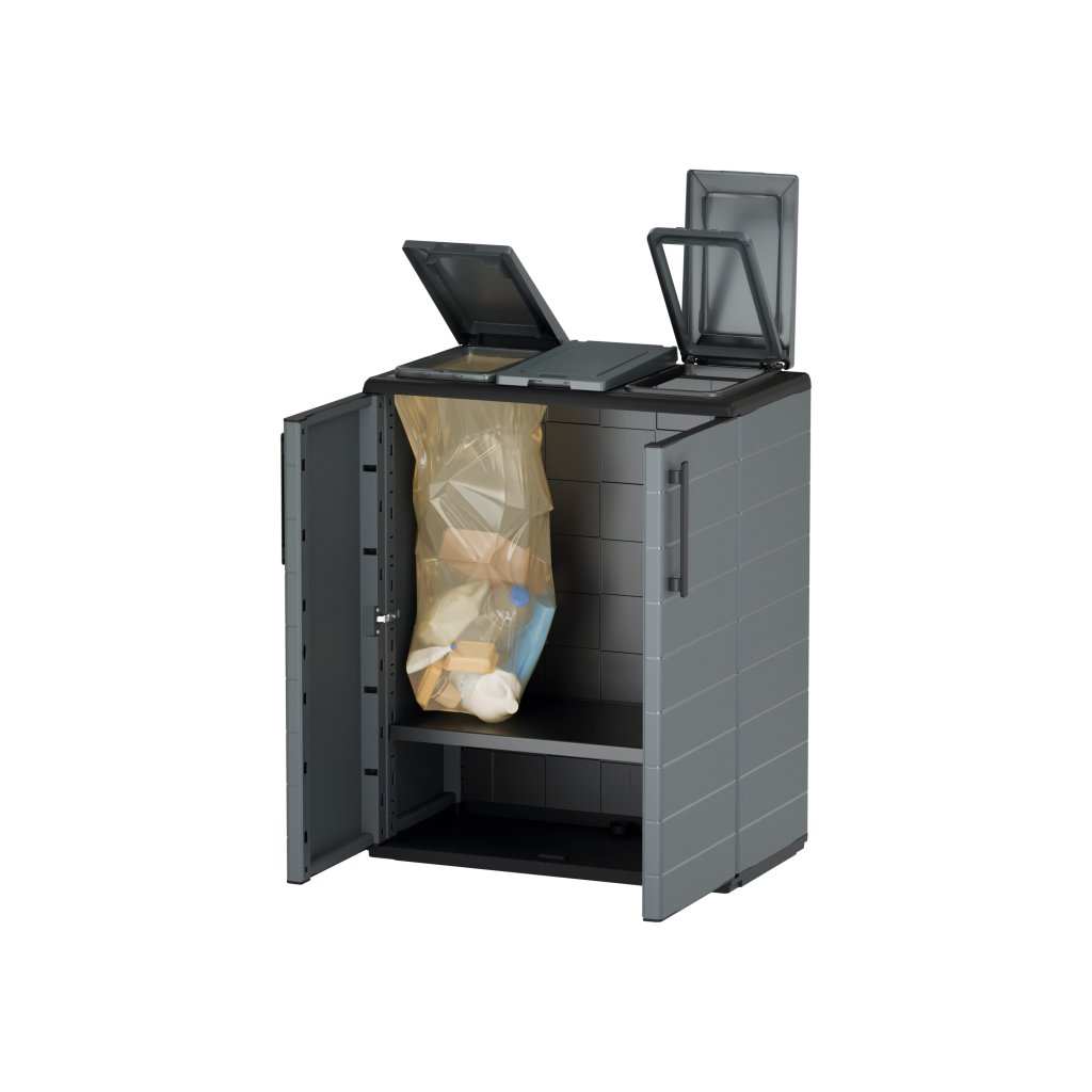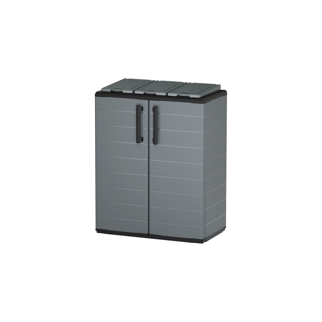 Skříň je vyrobena z recyklovaného polypropylenu, je odolná vůči vlhkosti a pachům a vhodná pro vnitřní i kryté venkovní prostory.