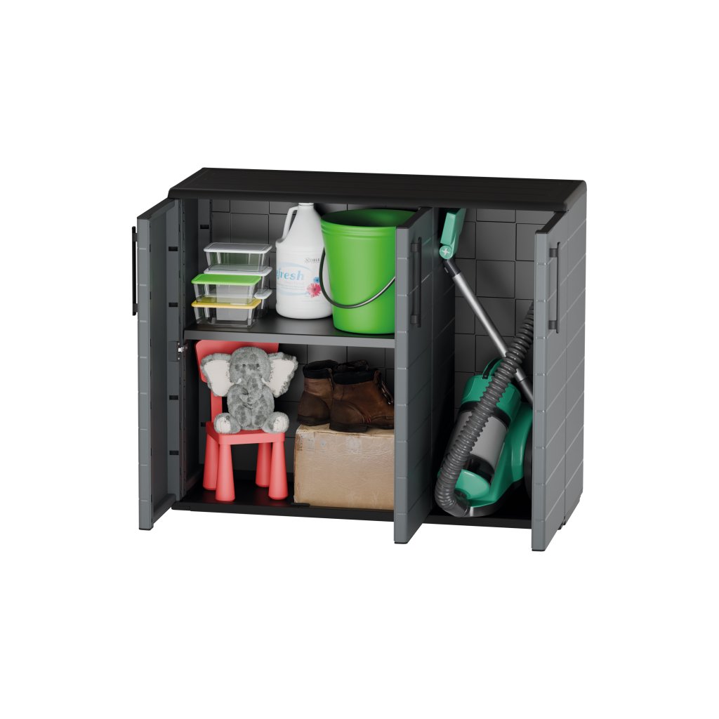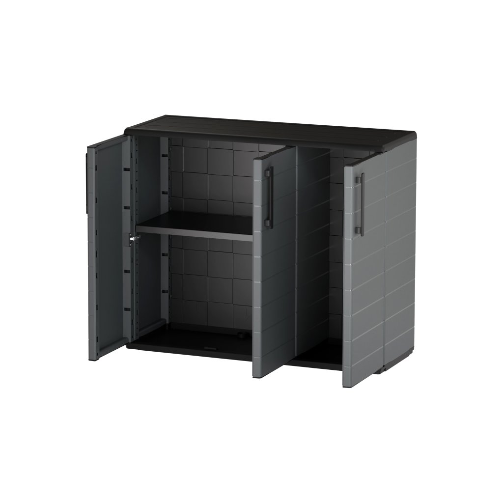 vnitřní police je výškově nastavitelná a má nosnost až 20 kg, nízká a široká plastová skříň s policí, ideální pro balkon, garáž nebo terasu.