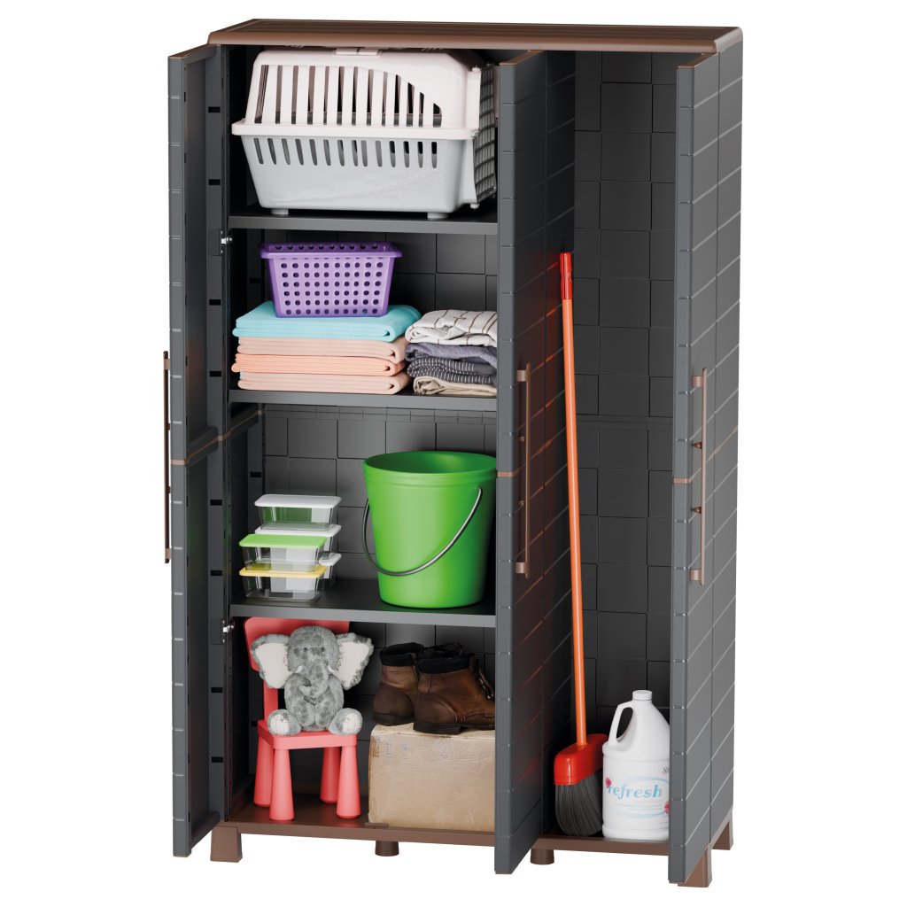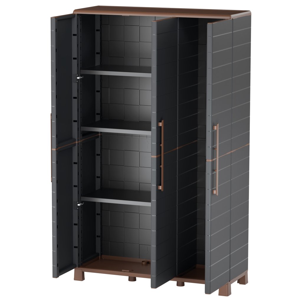 Skříň je vyrobena z kvalitního recyklovaného polypropylenu, odolného proti vlhkosti, snadno omyvatelného a vhodného pro vnitřní i kryté venkovní použití. Nastavitelné police mají nosnost až 20 kg, ocelové panty zajišťují dlouhou životnost.