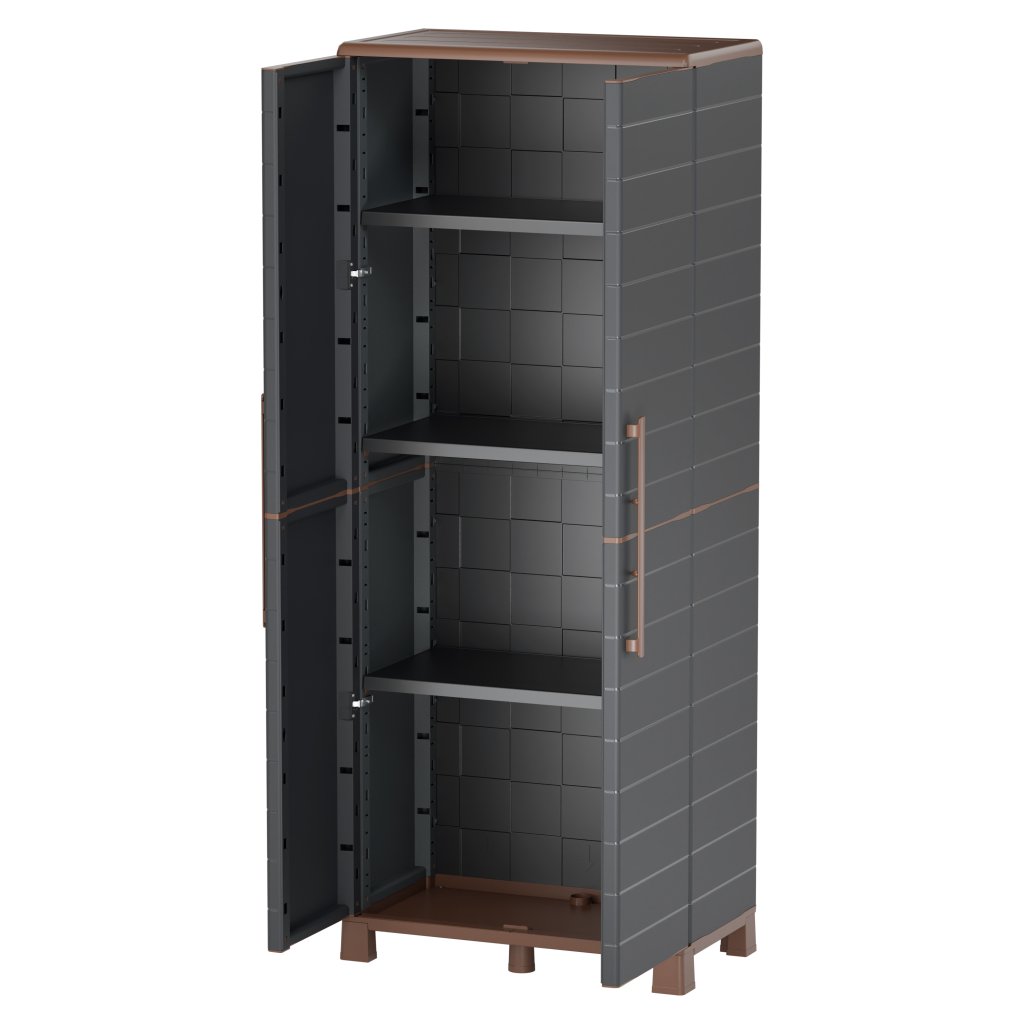 Vysoká plastová skříň PORTOFINO P70/TP je ideální pro efektivní využití vertikálního prostoru. Hodí se do garáží, technických místností, prádelny, sklepa nebo na kryté terasy.