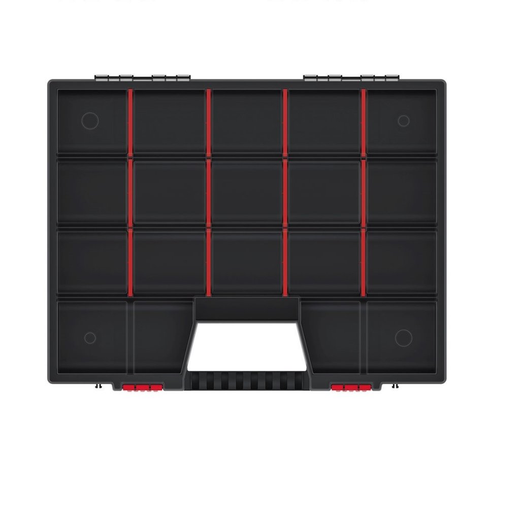 Lehký, ale odolný PP plast zvládne dílenské prostředí, klipy v červené barvě drží víko pevně zavřené a nízký profil 65 mm šetří místo v zásuvkách, kufrech i regálech.
