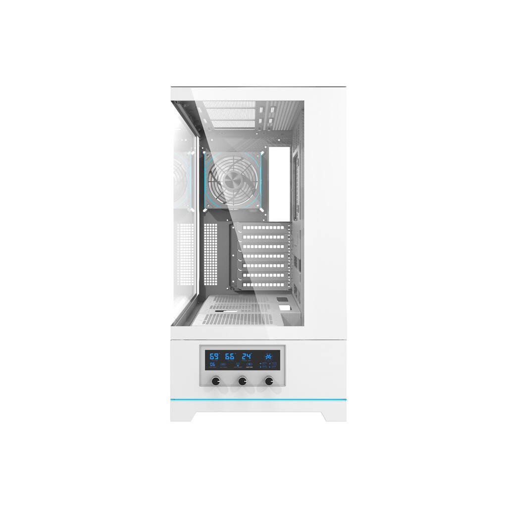 Skříň je vybavena digitálním systémem řízení teploty, který umožňuje v reálném čase monitorovat teploty CPU, GPU a vnitřního prostoru. Rychlost ventilátorů se nastavuje pomocí praktických knoflíků na předním panelu, což vám umožní dokonale přizpůsobit chlazení vašim aktuálním potřebám a zátěži.