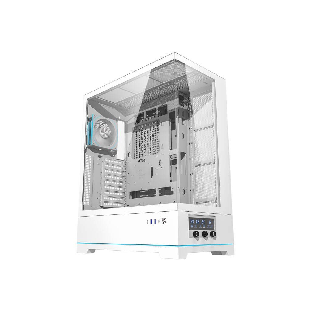 Skříň DY451L PRO je vybavena digitálním systémem řízení teploty se čtyřúrovňovou regulací otáček ventilátorů, který umožňuje nastavit chlazení podle vašich aktuálních potřeb. Na displeji na předním panelu se zobrazují teploty CPU, GPU a vnitřku skříně, což vám dává plnou kontrolu nad chlazením systému.