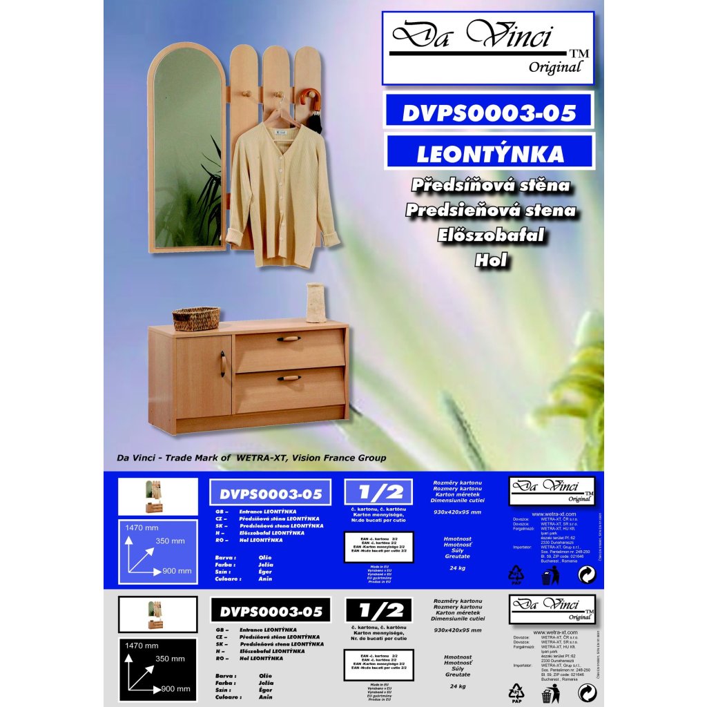 Leontýnka - předsíňová stěna. Povrchová úprava dekor olše. Materiál LDF. Stěna je vhodná pro všechny předsíně. Komoda - botník dělená do tří částí dva šuplíky na boty a jedna skříňka. Elegantní věšák se zrcadlem. Velmi stylová.