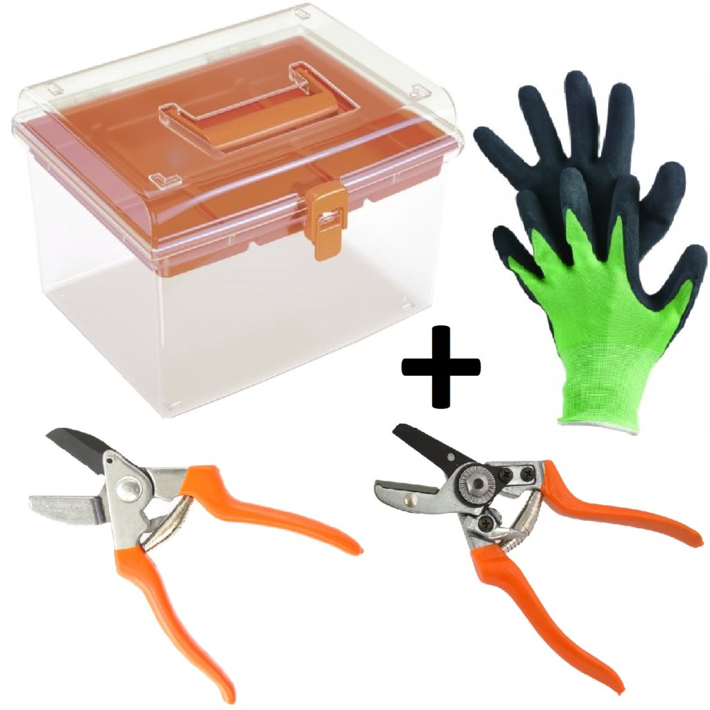 Průhledný box na nářadí + zahradní rukavice a 2x zahradní nůžky Gardenius