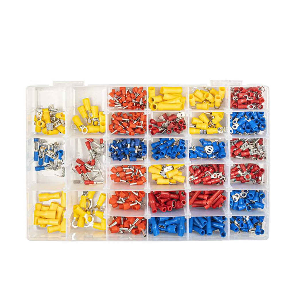 Sada izolovaných elektrických konektorů a svorek, barevně odlišených dle průřezu vodiče (červená, modrá, žlutá). Obsahuje očkové, vidličkové, ploché a spojovací konektory, ideální pro krimpování v elektroinstalacích, autoopravárenství, dílnách i domácím použití. Uloženo v praktickém plastovém boxu.