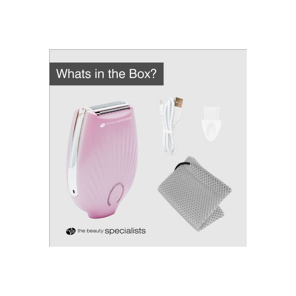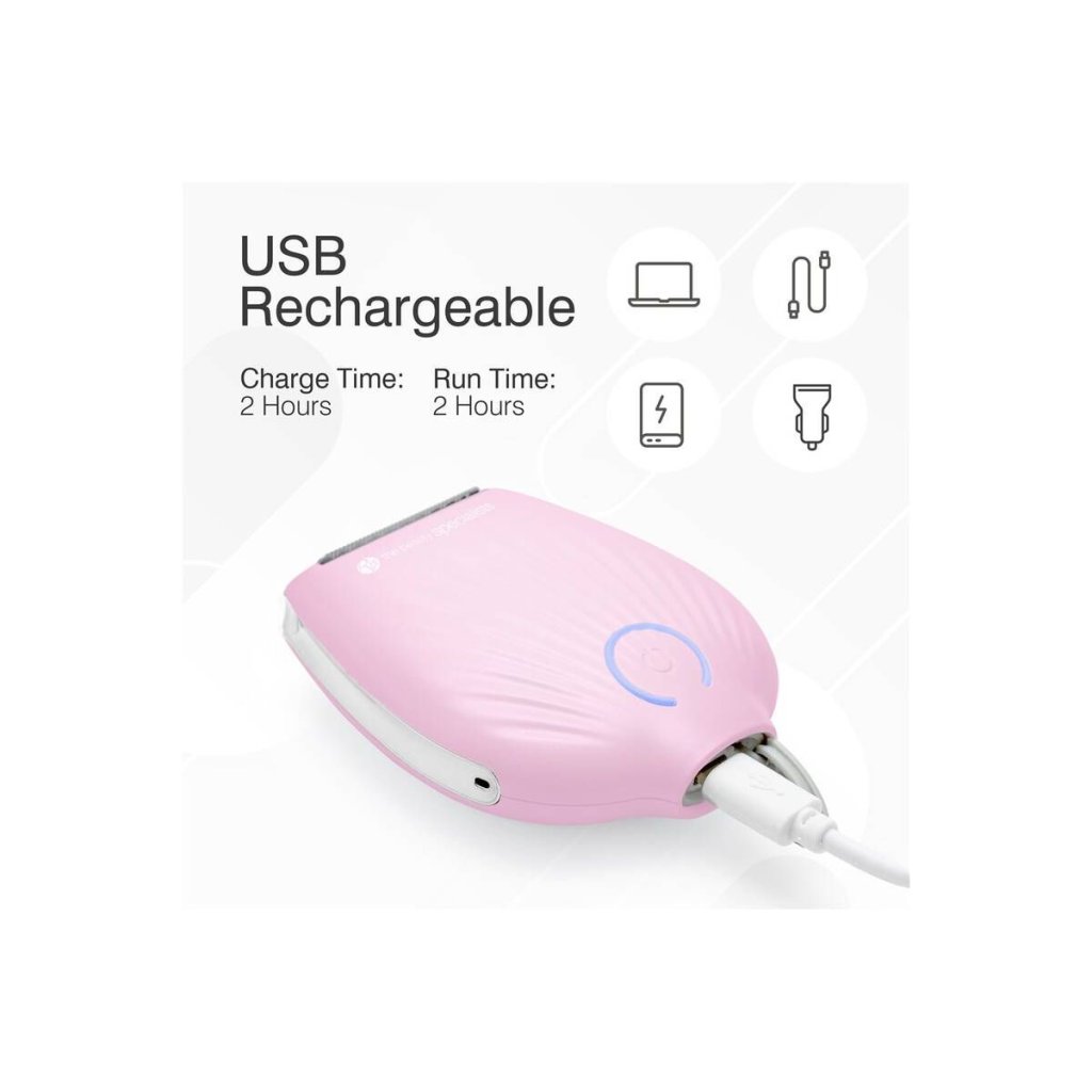 Cestovní dámský holicí strojek. Kompaktní, lehký, praktický. Voděodolný IPX4, unoverzální holcí břit, s cestovním pouzdrem, doba provozu na jedno nabití 90 minut, nabíjení přes USB kabel. Barva perleťově růžová/chrom