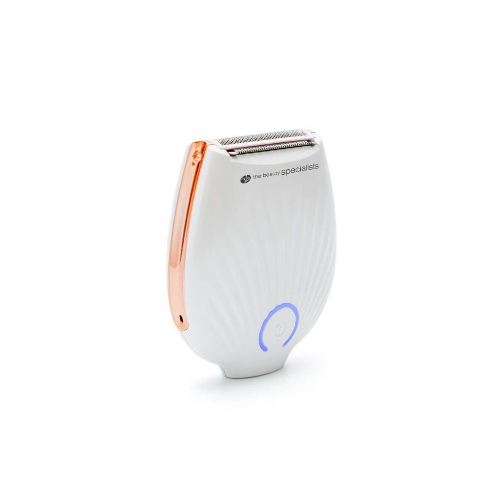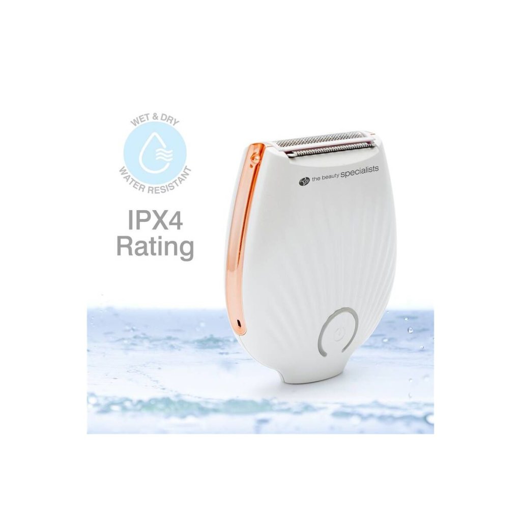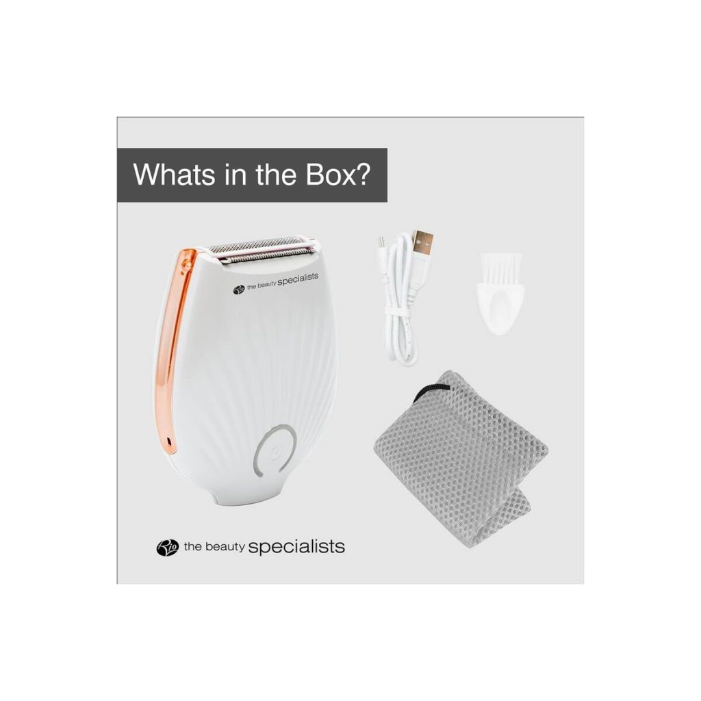 Cestovní dámský holicí strojek. Kompaktní, lehký, praktický. Voděodolný IPX4, unoverzální holcí břit, s cestovním pouzdrem, doba provozu na jedno nabití 90 minut, nabíjení přes USB kabel. Barva perleťově bílá/růžové zlato.