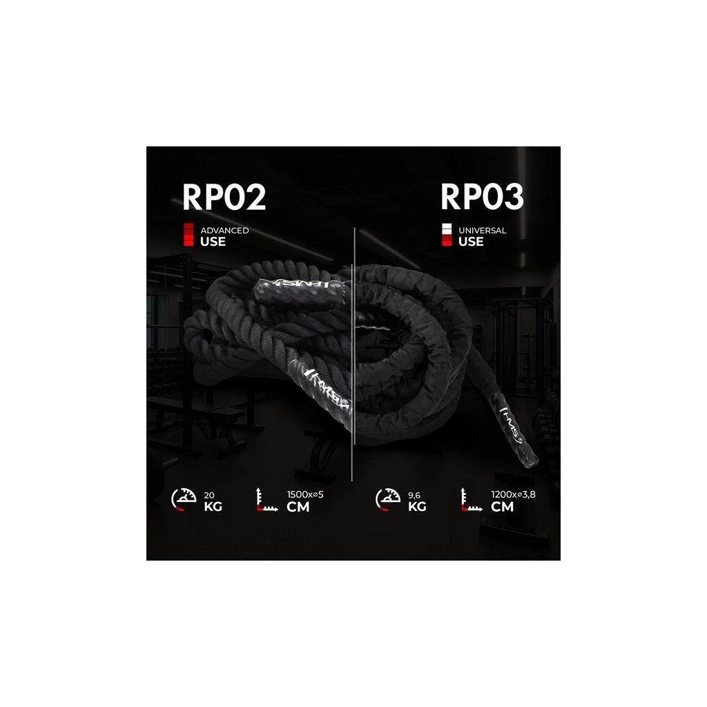 Lano HMS RP03 je skvělou pomůckou k rozvoji síly, kondice, vytrvalosti a výbušnosti. Takzvaný Battle Rope je velmi oblíbené mezi příznivci funkčního tréninku. Také je velmi vhodným doplňkem pro posílení horních částí těla, zejména ramen a paží. Lano je velmi efektivní pomůckou pro trénink bojových sportů. Na konci je vybaveno ochrannými kryty pro lepší uchopení. Posilovací lano HMS RP03 zlepšuje koordinaci, vytrvalost a smysl pro rovnováhu.
