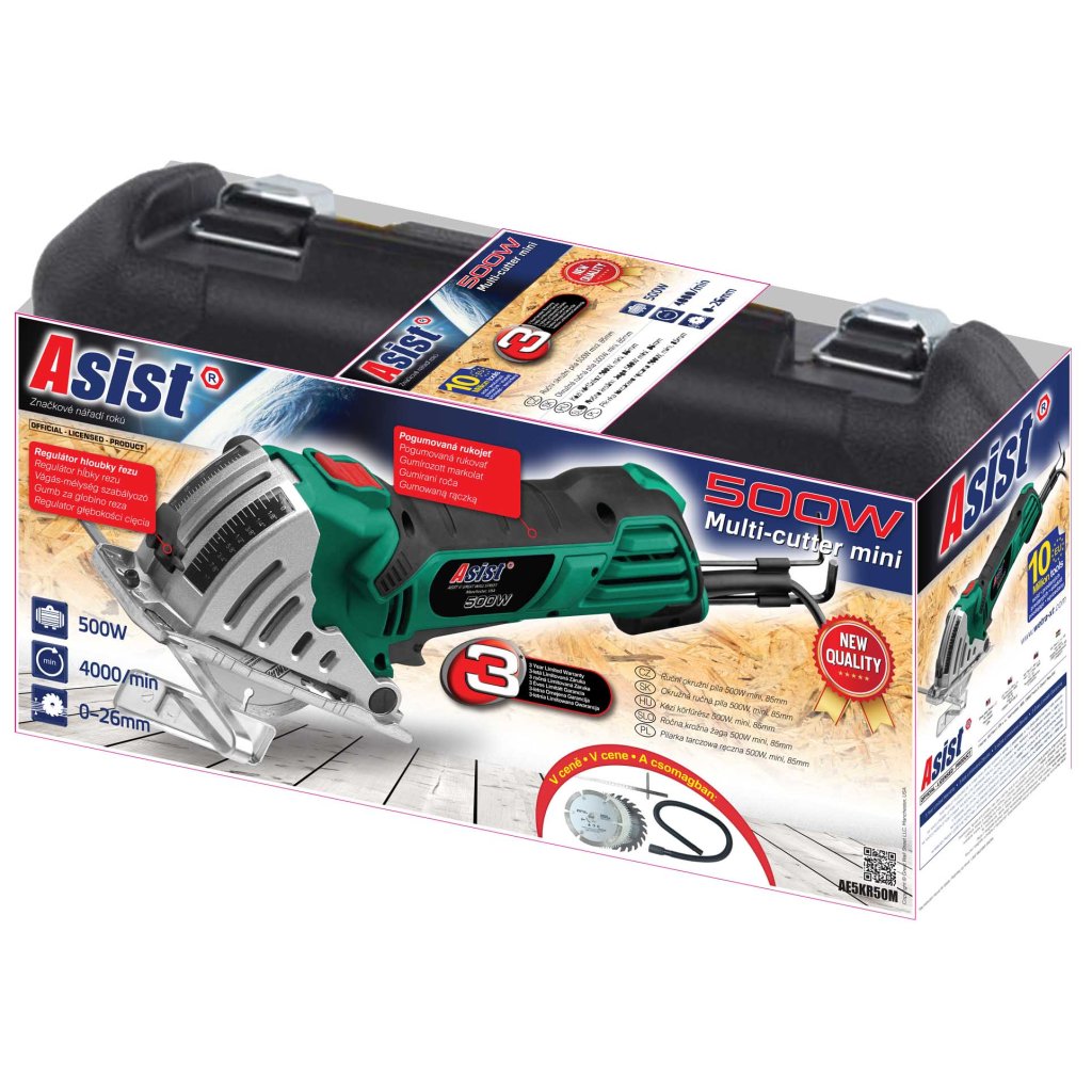 ASIST AE5KR50M - je ruční okružní pila moderního vzhledu i použití. Její příkon činí 500 Wattů. Disponuje možností přesného řezu díky vodící paralelní nastavitelné liště. Má silný výkon a minimalistické provedení. Nabízí univerzální použití díky několika typům kotoučů průměru 85 milimetrů. Skvěle se drží, protože má softgrip rukojeť. Pokud použijete při jejím použití odsávací hadici na prach ušetříte si spoustu práce s úklidem a také omezíte prašnost pracovního prostředí na minimální úroveň.