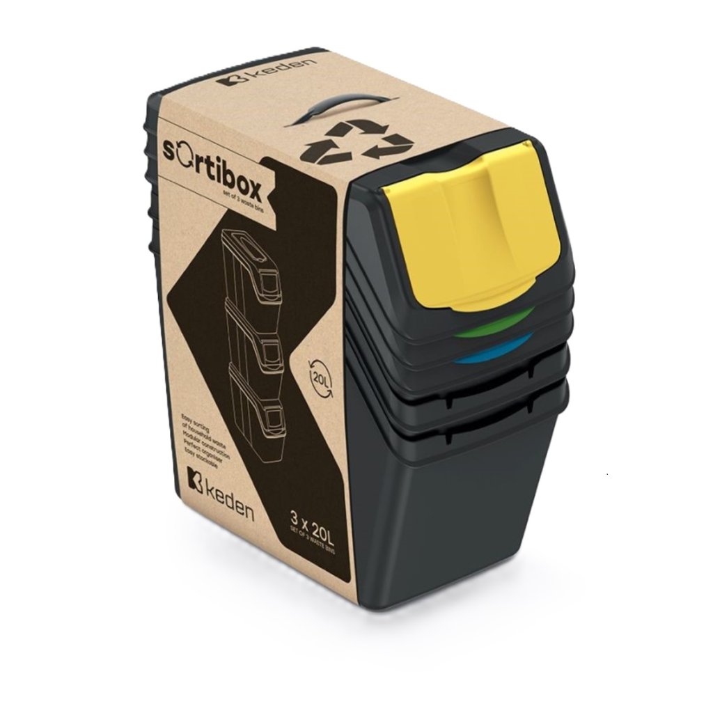 Koše mají odklápěcí chlopně a pohodlné rukojeti. Sada obsahuje samolepky s označením odpadu. Nádoby lze použít k oddělení, například: papír, sklo, plast.