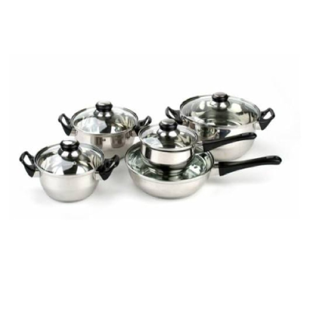 Sada moderního nerezového nádobí se skleněnými poklicemi a bakelitovými úchyty. Vhodná na elektriku, plyn a sklokeramiku.