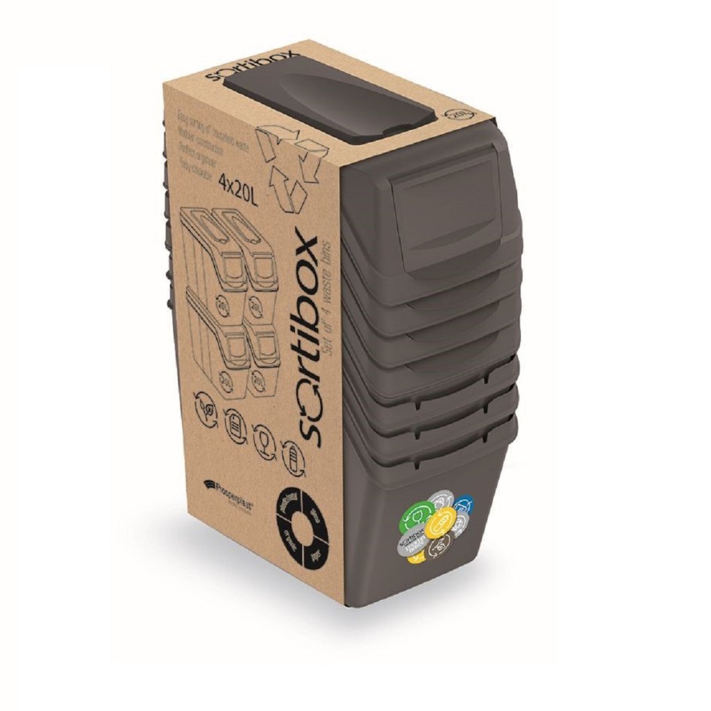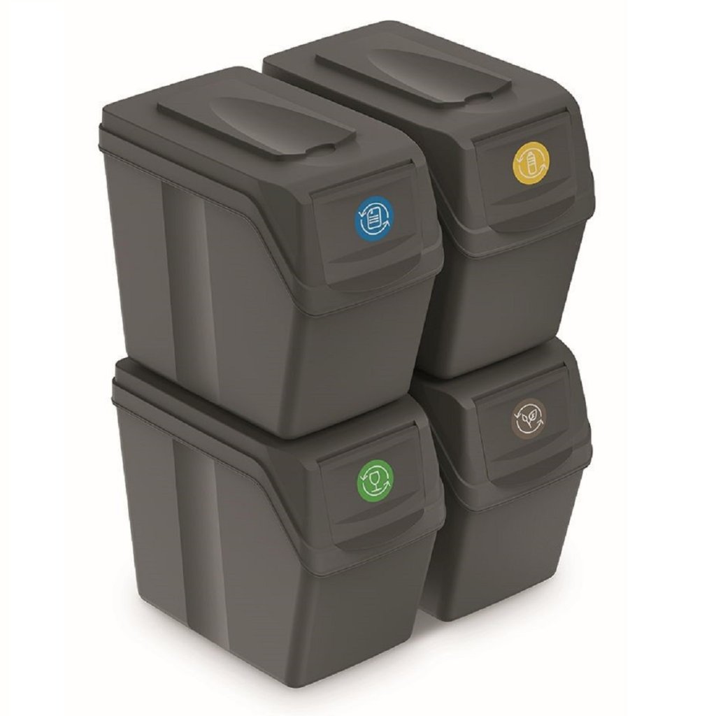 Sada čtyř odpadkových košů o objemu 20 litrů určených pro třídění odpadu. Barevná víka odlišují obsahy jednotlivých nádob.