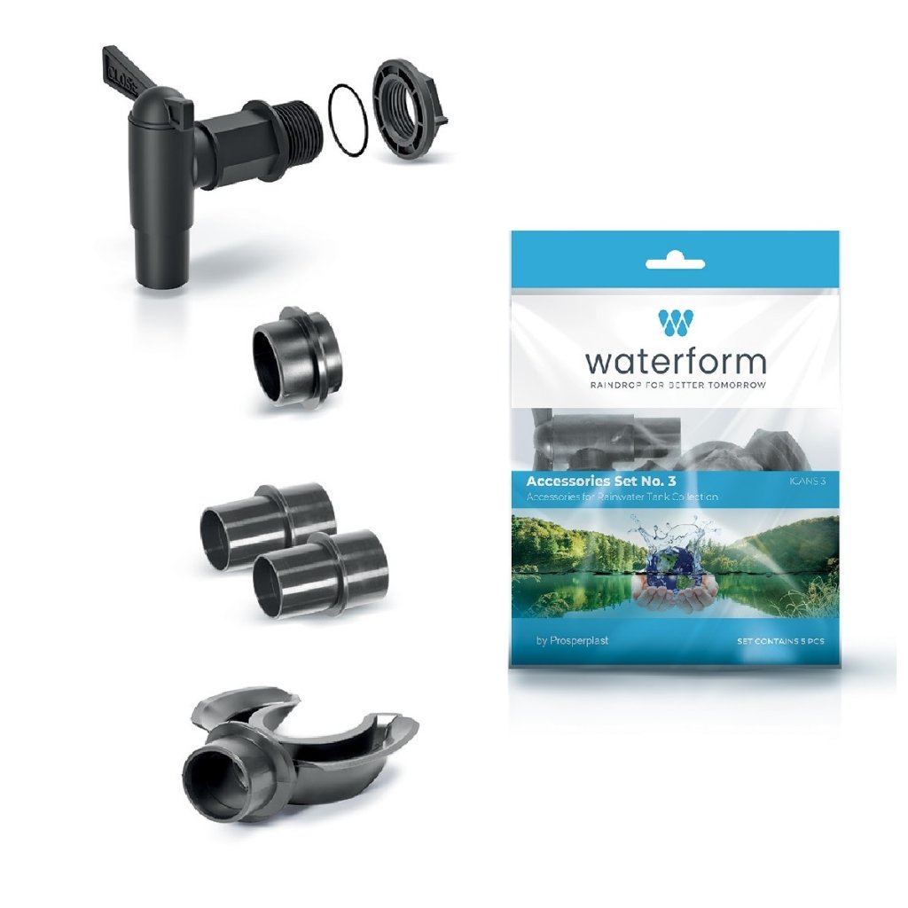 ICANS3 - Systém pro přívod a odvod dešťové vody ze sudu. Kohoutek je opatřen těsněním a maticí, díky které je kompatibilní se všemi sudy na dešťovou vodu sortimentu Waterform. Sada obsahuje 5 dílů: 3 redukce; lapač vody; kohoutek.