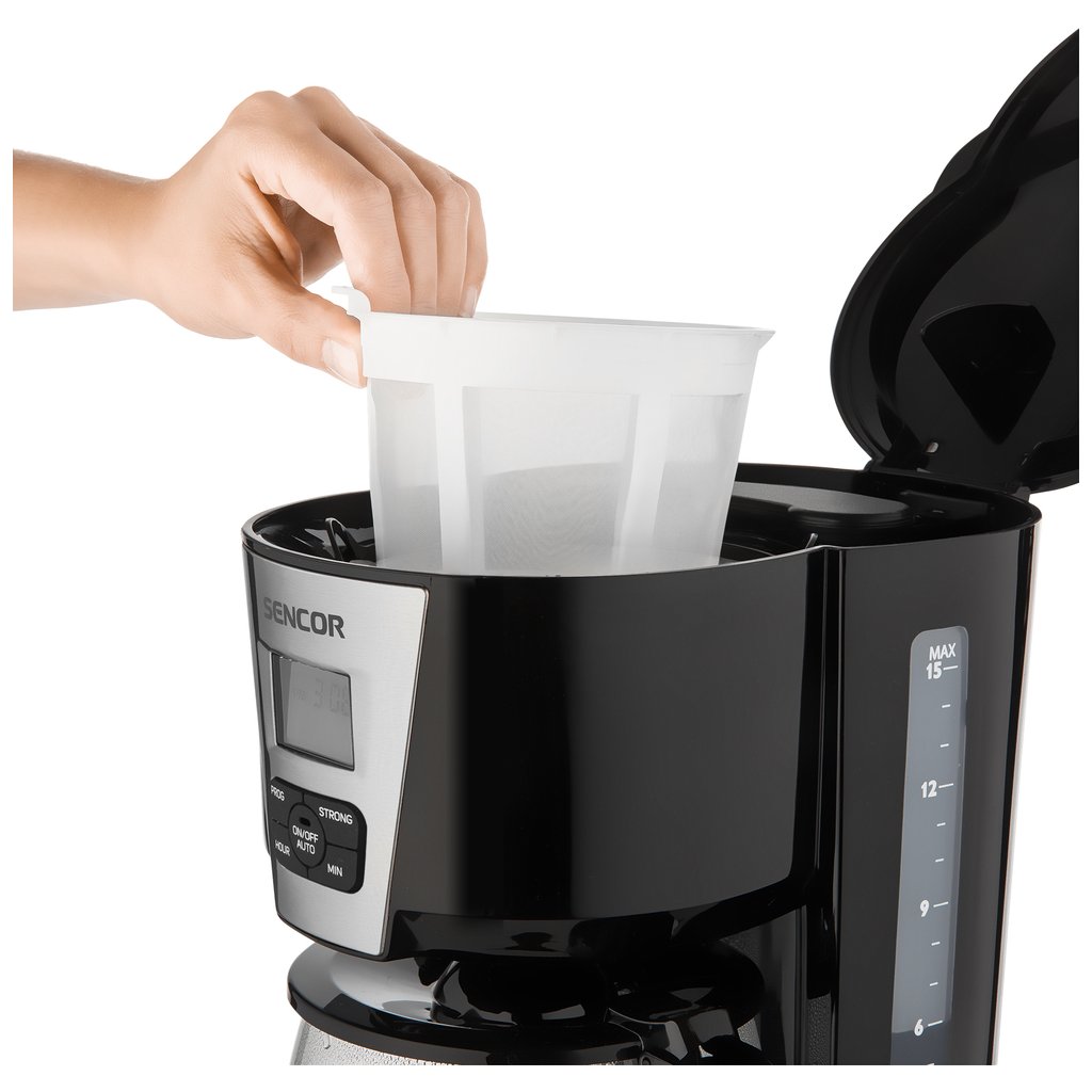 objem nádoby 1,8 l, vyjímatelný omyvatelný trvalý filtr, ochrana proti přehřátí, 1000 W