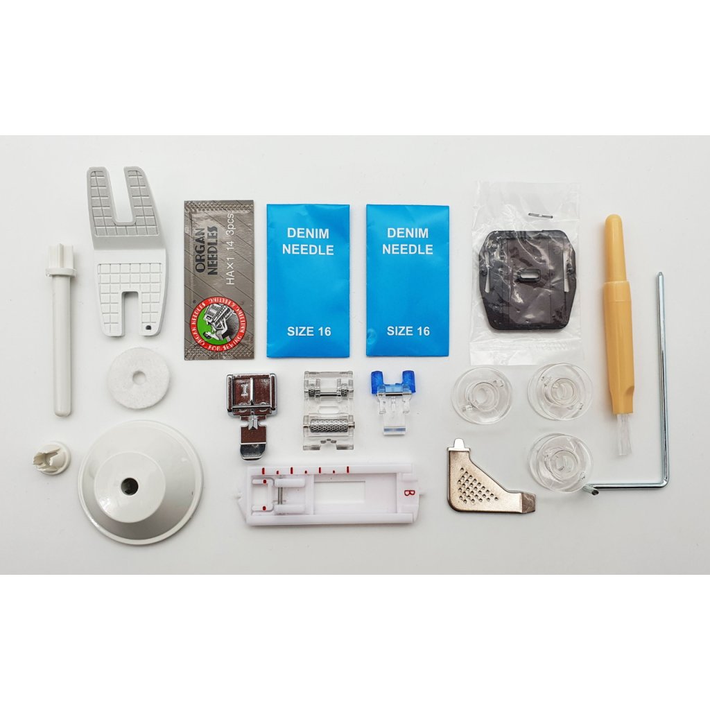 Se strojem navíc přichází i bohaté příslušenství zahrnující univerzální a zipovou patku, patku na 4-krokové šití knoflíkových dírek, knoflíkovou patku, páráček, vodič okraje, kryt podavače, 2. kolík cívky nezbytný pro šití dvojjehlou a balíček jehel.