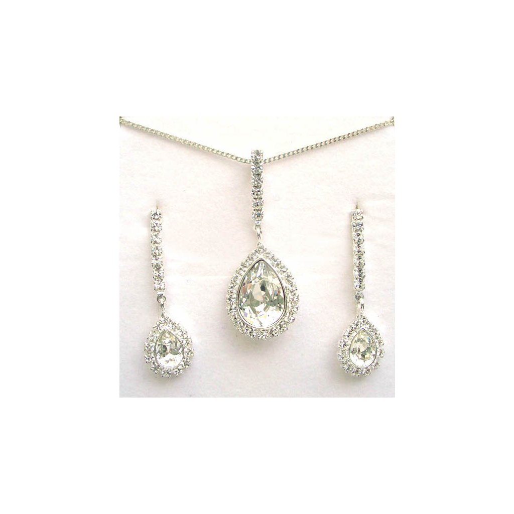 Štrasová souprava šperků zdobena krystaly CRYSTALLIZED - Swarovski Elements. Skládá se z rhodiovaného řetízku, přívěsku s čirým krystalem a z náušnic s celkovou délkou 37 milimetrů. Je vhodná jako dárek jak pro ženy, tak i pro dívky.