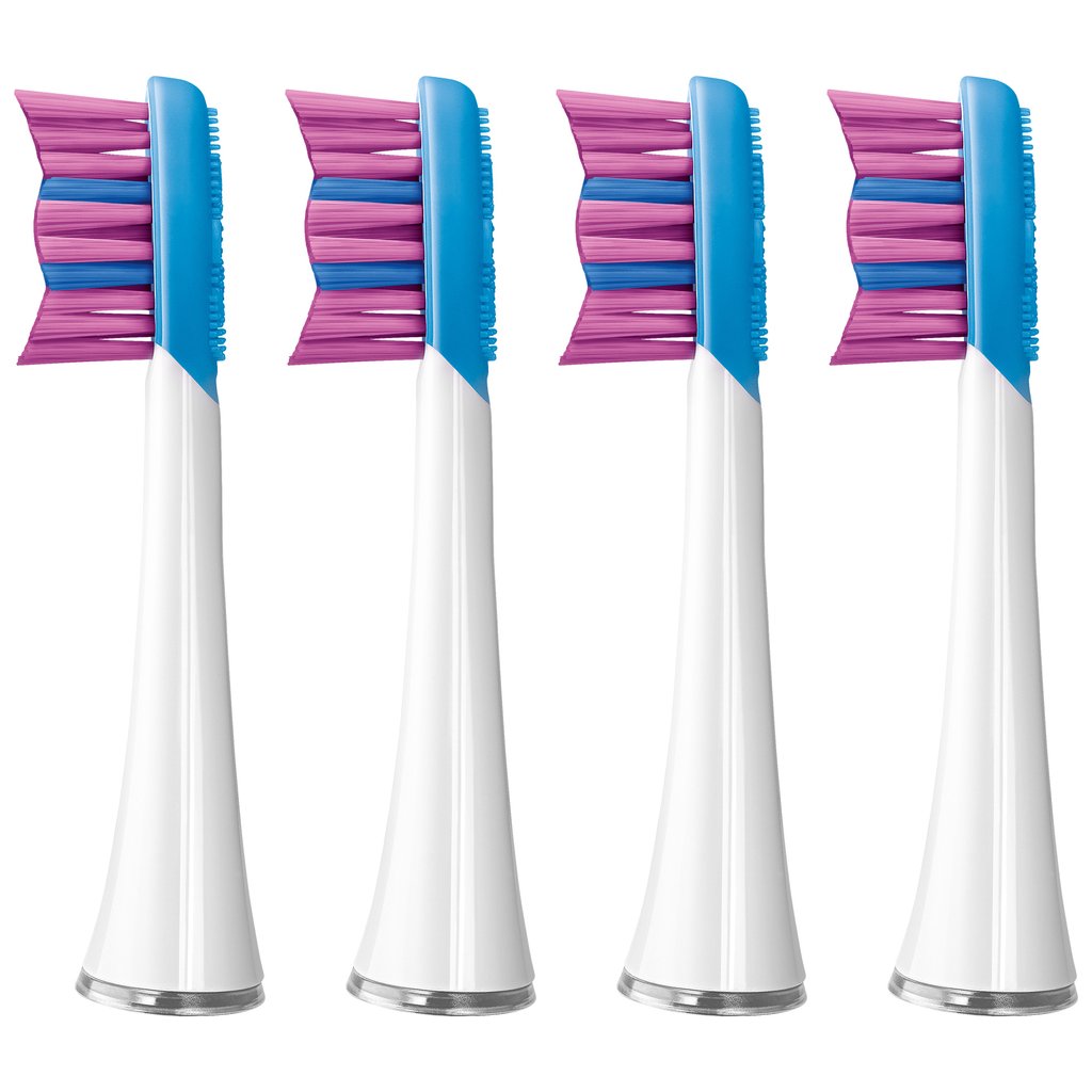 Kompatibilní se zubními kartáčky SENC R S C 1x, S C 2x a S C 3x Silikonová strana hlavice pro čištění jazyku Silikonové centrální štětiny pro extra citlivou péči Speciální štětinky s indikací použitosti, které ztrácí barvu používáním a tím signalizují ideální dobu pro výměnudstraňuje více plaku než ruční kartáček Velice jednoduchá výměna Vhodné pro každodenní čistění 4 kusy v 1 balení