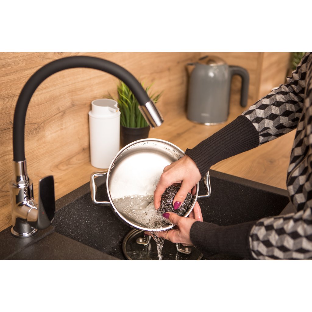 Jak používat: Navlhčete drátěnku, přidejte malé množství saponátu a krouživými pohyby odstraňte nečistoty. Po práci opláchněte teplou vodou, pro osvěžení lze občas přelít vroucí vodou.