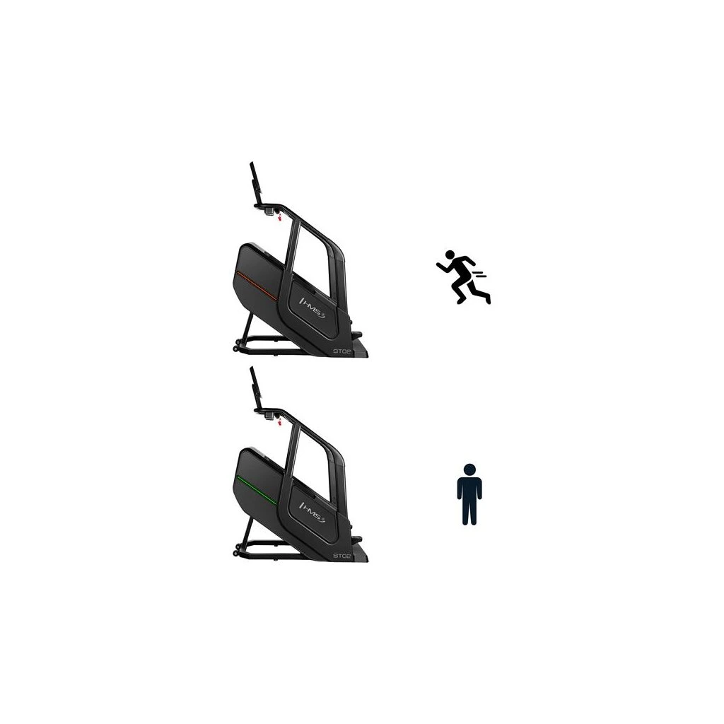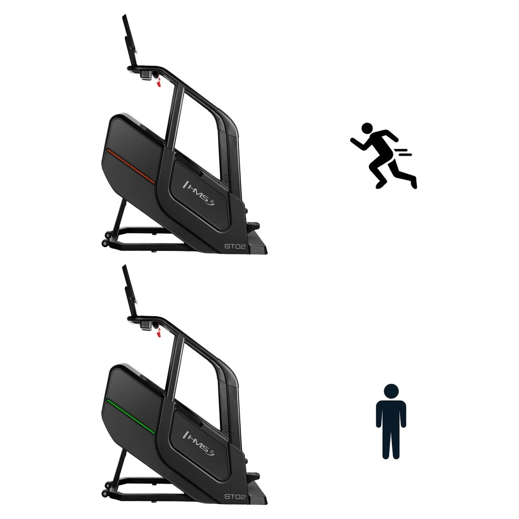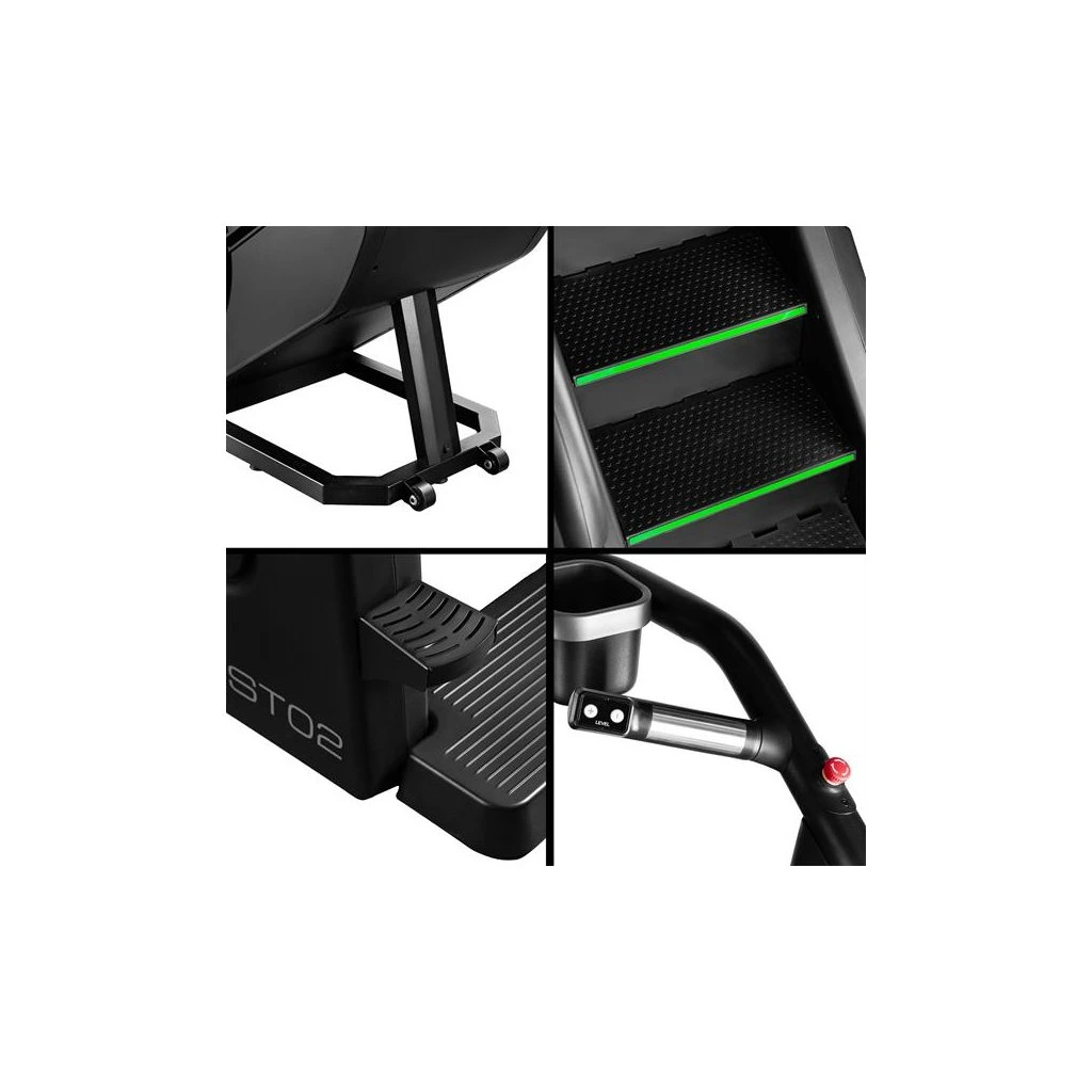 Schody ST02 je vybaven funkcemi měření rychlosti, počtu kroků, vystoupané výšky, času, spálených kalorií, tepové frekvence a tělesného tuku, které vám umožní sledovat vaše pokroky a přizpůsobit trénink vašim individuálním cílům. Bezdrátová nabíječka umožňuje pohodlné nabíjení mobilních zařízení během cvičení. Intuitivní ovládací panel s tlačítky pro regulaci rychlosti a tlačítky start/stop na madlech zajišťuje jednoduché a rychlé ovládání.