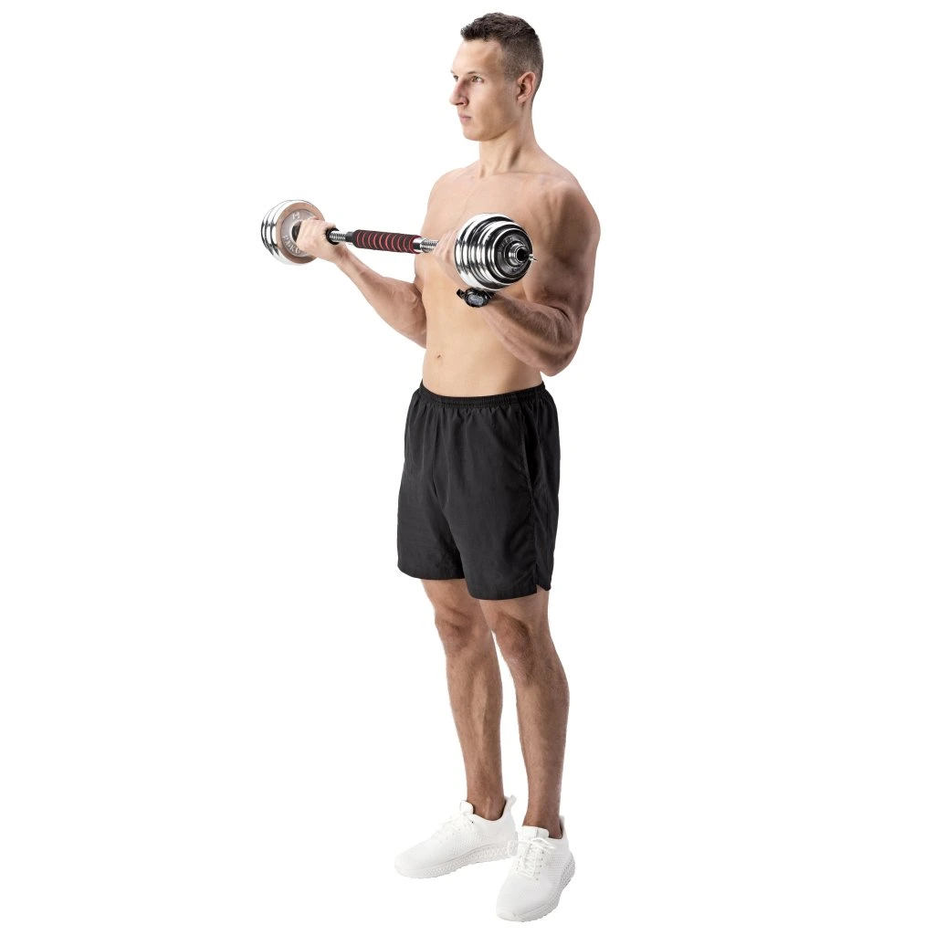 Činky jsou vyrobeny z vysoce kvalitní, chromované oceli, která je zárukou dlouhé životnosti. Kotouče se proti posunutí zajišťují šroubovacími zámky, které jsou dodatečně jištěny šroubem s křídlovou matkou.