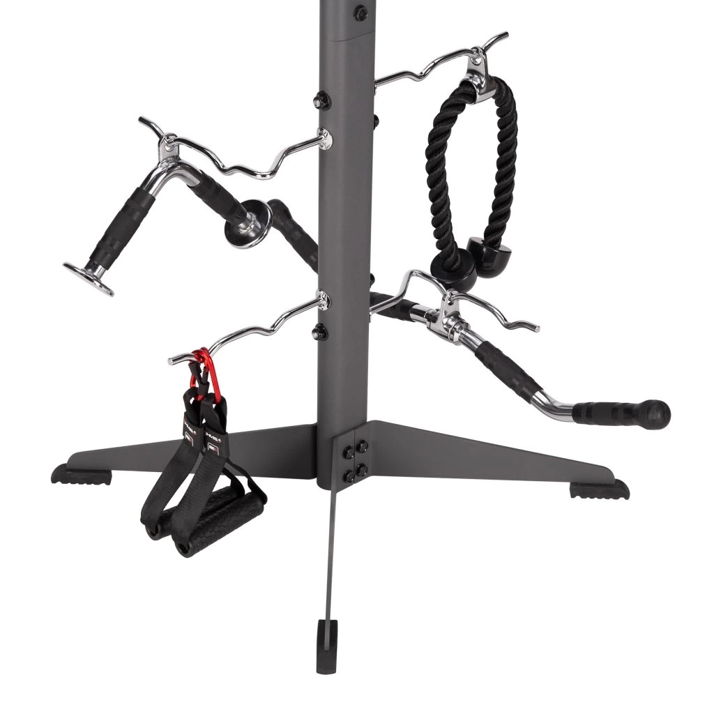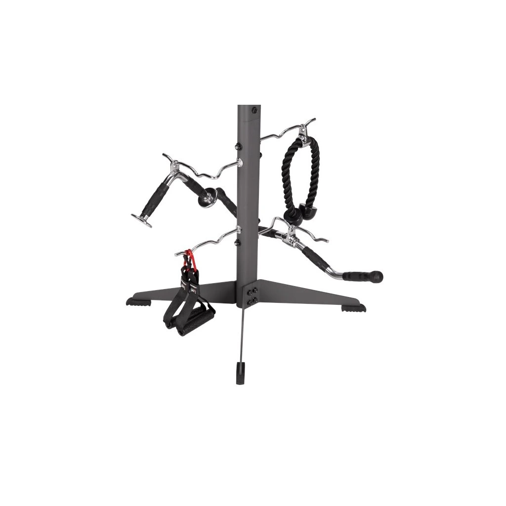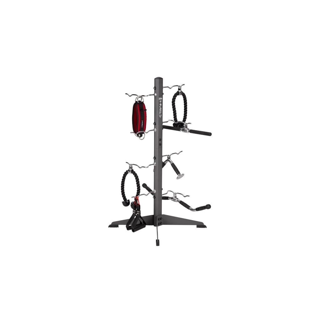 Stojan STR33 má širokou základnu o rozměrech 55 x 55 centimetrů pro skvělou stabilitu a pevnost. Stojan je vybaven osmi háčky, na které můžete zavěsit různé fitness doplňky, jako jsou švihadla, adaptéry ke kladkám nebo například odporové gumy. Každý háček zvládne zatížení až 30 kg a díky jeho tvaru lze na každý háček zavěsit více kusů vybavení bez obav o pád z háčku.