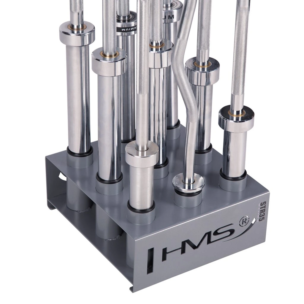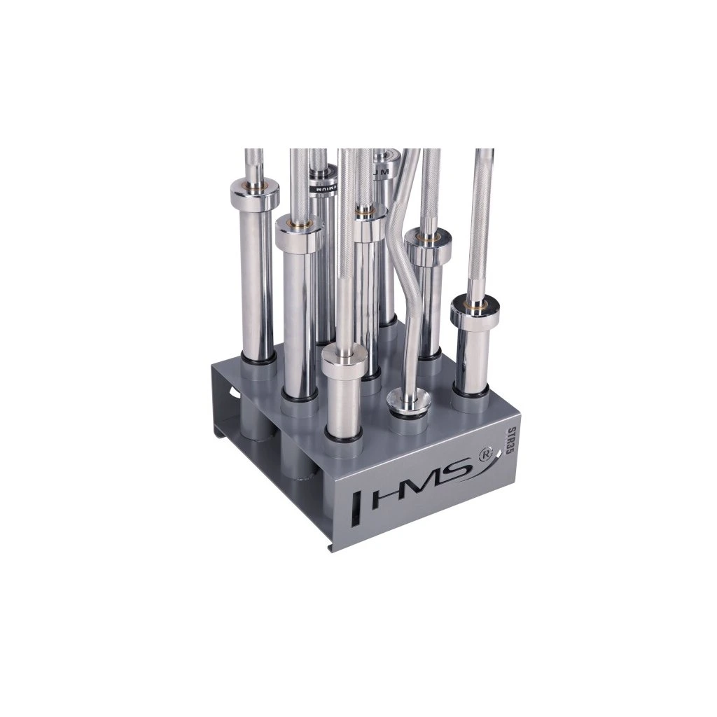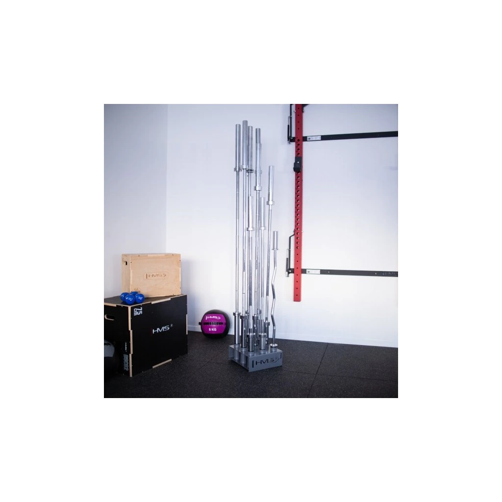 Stojan na olympijské osy STR35 od společnosti HMS vám ušetří spoustu místa ve vašem tréninkovém prostoru. Umožňuje postavit devět os vedle sebe ve svislé poloze.