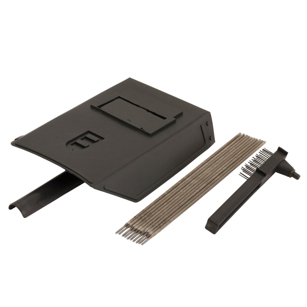 1x uzemňovací kabel 300A 3m 1x svorka 200A 3m 1x kladivo/kartáč na čištění a oklepávání strusky 1x svářecí štít 10 elektrod 2,5mm
