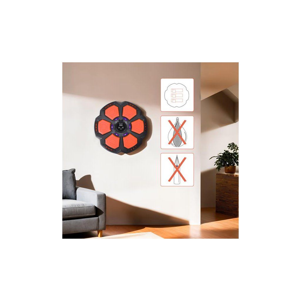 Terč je lehký a praktický na používání a jeho montáž probíhá pomocí suchých zipů – bez potřeby šroubů nebo nářadí. Díky tomu lze TB06 pověsit téměř kdekoli, kde je kousek rovné stěny. Jeho malé rozměry jej ideálně začlení do domácích prostor, aniž by zabíral příliš místa.