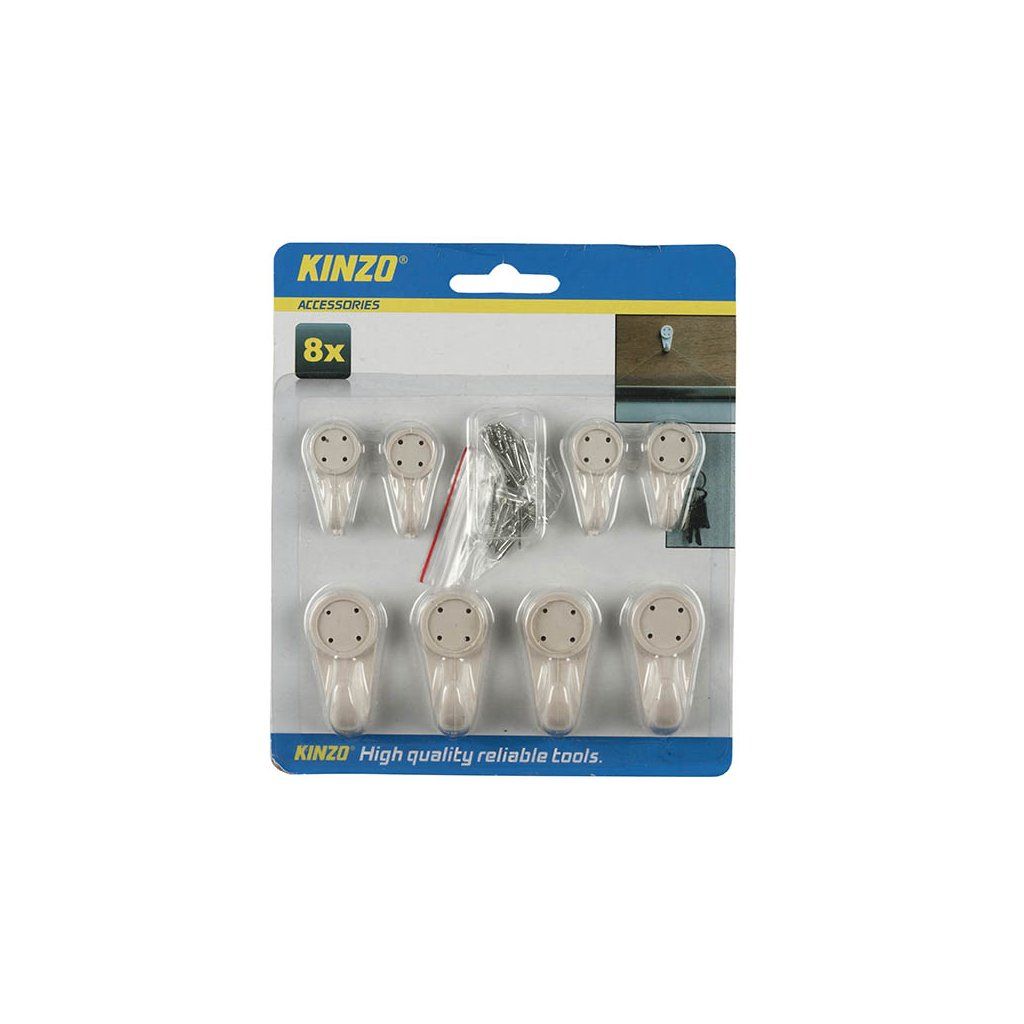 Sada twenty háčku značky KINZO pro zavěšení obrazů, zrcadel, kalendářů a podobně. Sada se skládá ze čtyř háčků velikosti Maxi a čtyř háčků velikosti Uni. Jejich nosnost je 20 kilogramů. Dodávají se včetně 32 hřebíčků.