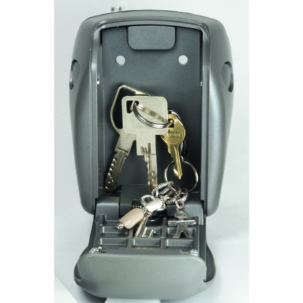 Úložný box na klíče, tělo ze slitiny zinku, má zesíleny a odolný kryt, který odolová vlivům pčasí a je vhodný i pro venkovní použití, kde může být přidělán na stenu. Nastavitelná čtyř místná kombinace kódu.