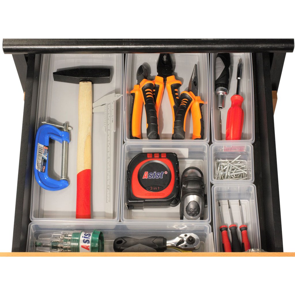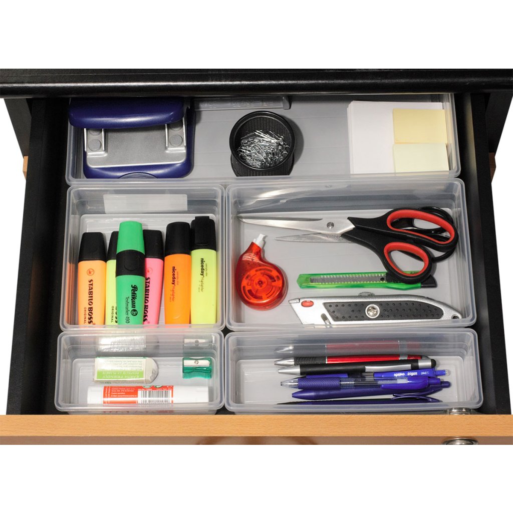 Transparentní provedení s šedým protiskluzovým dnem Non-Slip a protiskluzovou spodní částí (aby box lépe držel).Boxy jsou snadno omyvatelné a při čištění oceníte, že nemusíte najednou vyndat celou zásuvku věcí, ale pouze to co potřebujete uklidit.Dělení boxů umožňuje ze zásuvky např. v kanceláři, dílně nebo pro vaše hobby vyndat jen ten box, který potřebujete a mít jej při ruce.
