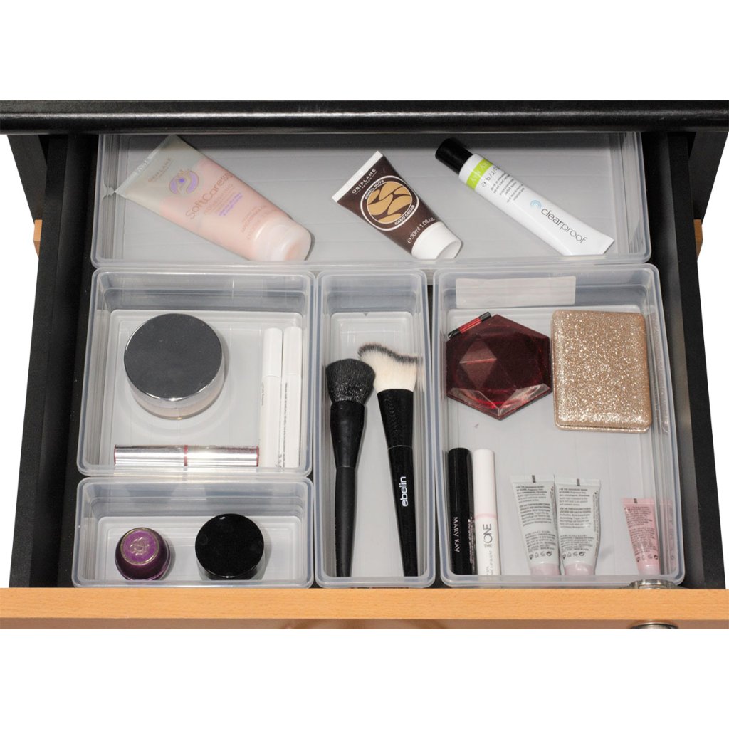 Transparentní provedení s šedým protiskluzovým dnem Non-Slip a protiskluzovou spodní částí (aby box lépe držel).Boxy jsou snadno omyvatelné a při čištění oceníte, že nemusíte najednou vyndat celou zásuvku věcí, ale pouze to co potřebujete uklidit.Dělení boxů umožňuje ze zásuvky např. v kanceláři, dílně nebo pro vaše hobby vyndat jen ten box, který potřebujete a mít jej při ruce.