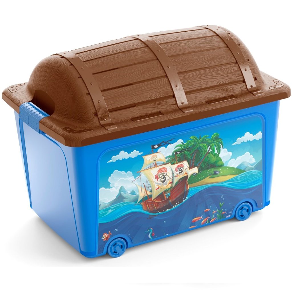 Úložný box je na kolečkách, takže i děti ho snadno přemístí ve svém pokoji. Design na motivy pirátské truhly zapadne do každého dětského pokojíčku.