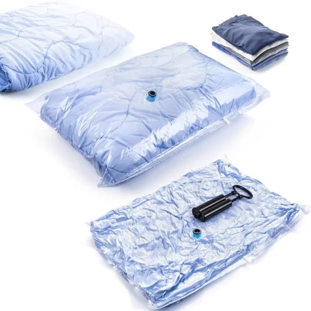 Sada 2ks úložných vaků 45 x 70 cm + pumpička VACUUM. Úložný vak slouží jako ideální ochrana oděvů nebo textílie proti prachu, molům, vlhkosti nebo zápachu. Vak je antibakteriální a obsahuje vzduchotěsné zavírání a odsávací ventil pro všechny typy běžných vysavačů. Vak má silnou fólii zaručující dlouhou životnost a umožňuje opakované používání. Při skladování ušetříte až 80% místa. Zpětný ventil znemožňuje úniku vzduchu směrem ven.dsávací pumpa vyrobena z plastu. Materiál: PA + PE.