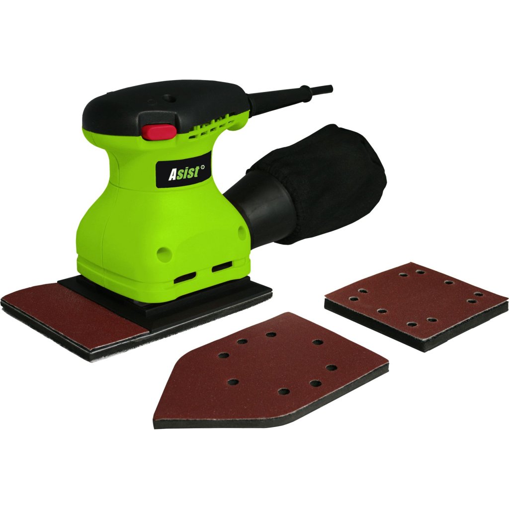 Vibrační bruska značky ASIST disponuje příkonem 240 Wattů. Bruska má tři vyměnitelné základny, které jsou na suchý zip. Velmi snadno základny vyměníte. Otáčky na prázdno 10000/min. Součástí balení je vak na odsávání brusného prachu a praktický kufřík.